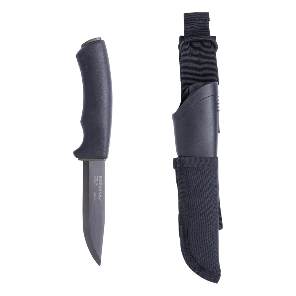 Das Morakniv Bushcraft Expert ist ein kompromissloses Survival-Messer für harte Einsätze in der Wildnis. Die 3.2 mm starke Klinge aus schwedischem Kohlenstoffstahl C100S bietet maximale Stabilität und eine beeindruckende Schärfe. Dank schwarzer DLC-Beschichtung ist die Klinge vor Korrosion und Reflexionen geschützt. Der geschliffene Klingenrücken ist kompatibel mit einem Feuerstahl und erzeugt zuverlässig Funken. Der ergonomische TPE-Griff mit ausgeprägtem Fingerschutz sorgt für sicheren Halt bei Nässe und Kälte. Die MOLLE-kompatible Scheide aus Polymer und Nylon macht das Messer jederzeit griffbereit.