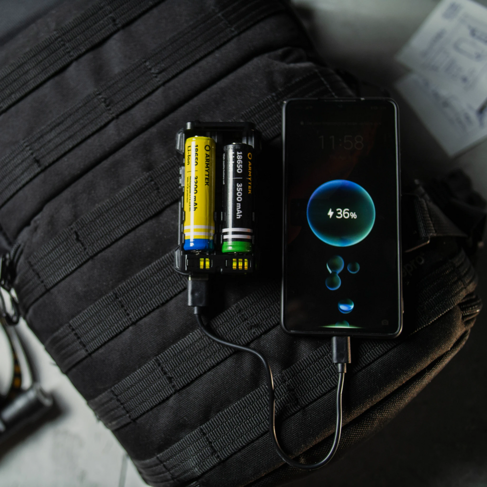 Ein tragbares, innovatives und intelligentes Ladegerät für 2 Batterien mit Powerbank Funktion für den alltäglichen und taktischen Gebrauch. Das spezielle Design ermöglicht einen zuverlässigen Transport von Batterien ohne Silikonstreifen.