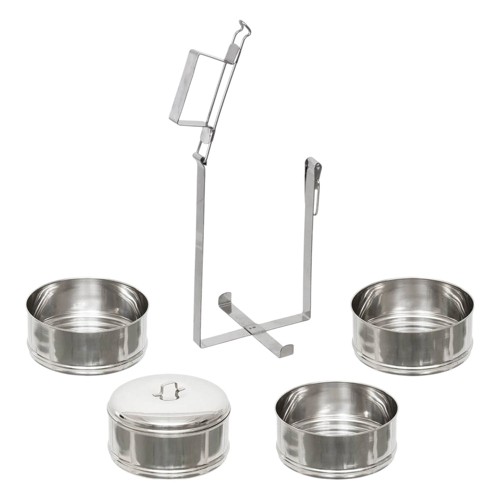 Dieser robuste 4-teilige Speisebehälter von Fox Outdoor ist ideal für unterwegs. Die vier stapelbaren Behälter aus 100 % Edelstahl bieten jeweils ein Fassungsvermögen von 1 Liter. Dank des Transportgestells mit Spannverschluss und Tragegriff bleiben die Behälter sicher zusammen und lassen sich bequem transportieren. Perfekt für Camping, Outdoor-Abenteuer oder den täglichen Gebrauch. Das langlebige Material ist pflegeleicht, rostfrei und geschmacksneutral.