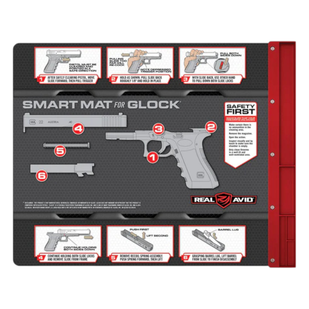 Die Real Avid Reinigungsmatte Glock Smart Mat ist eine durchdachte Arbeitsunterlage für das Reinigen und Zerlegen von Glock-Pistolen. Sie bietet sichtbar aufgedruckte Anleitungen zur Feldzerlegung, damit jedes Teil korrekt zugeordnet wird. Ein integrierter Teilefach verhindert das Verlieren von Stiften, Federn oder Schrauben beim Zerlegen. Die rutschfeste Unterseite und die ölresistente Oberfläche schützen Ihren Untergrund beim Reinigen. Durch die kompakte Grösse passt die Matte perfekt auf Werkbank, Tisch oder im Range-Bereich. Ideal für Schützen, Waffenwarte und Heimwerker, die Ordnung und Schutz beim Reinigungsprozess wollen.