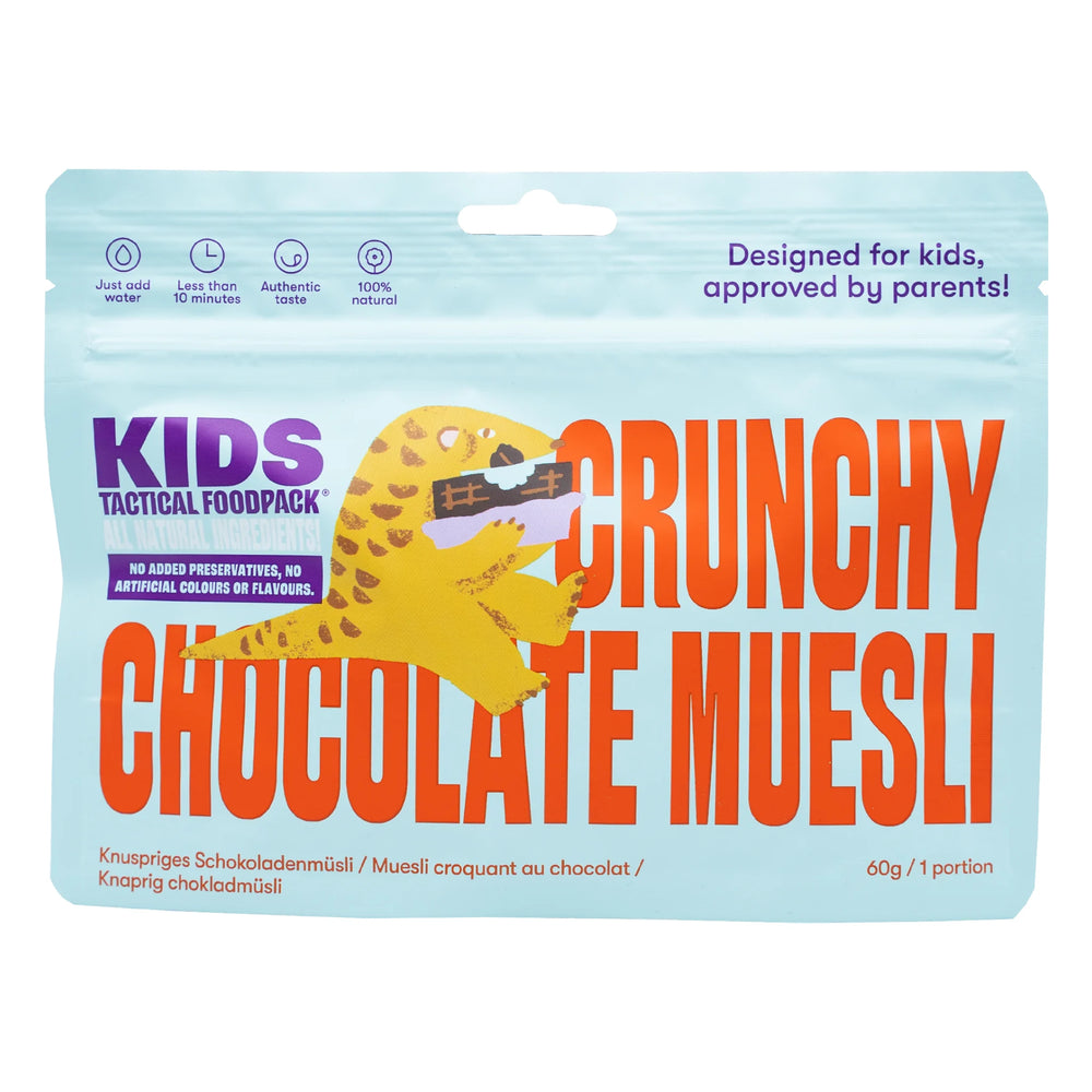 Ein leckeres und gesundes Frühstück, das Kinder lieben! Dieses knusprige Schokoladenmüsli wird wie hausgemachte Frühstücksflocken gebacken und mit Schokoladenstückchen verfeinert, um genau die richtige Menge Süsse zu liefern. Perfekt für einen frischen Start in den Tag, ob zu Hause oder draussen in der Natur. Einfach mit kaltem Wasser zubereiten und geniessen – 100% kinderfreundlich und von Eltern genehmigt!