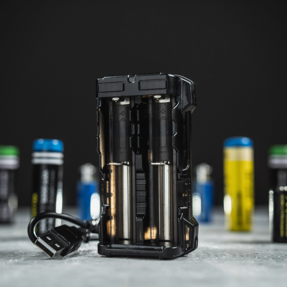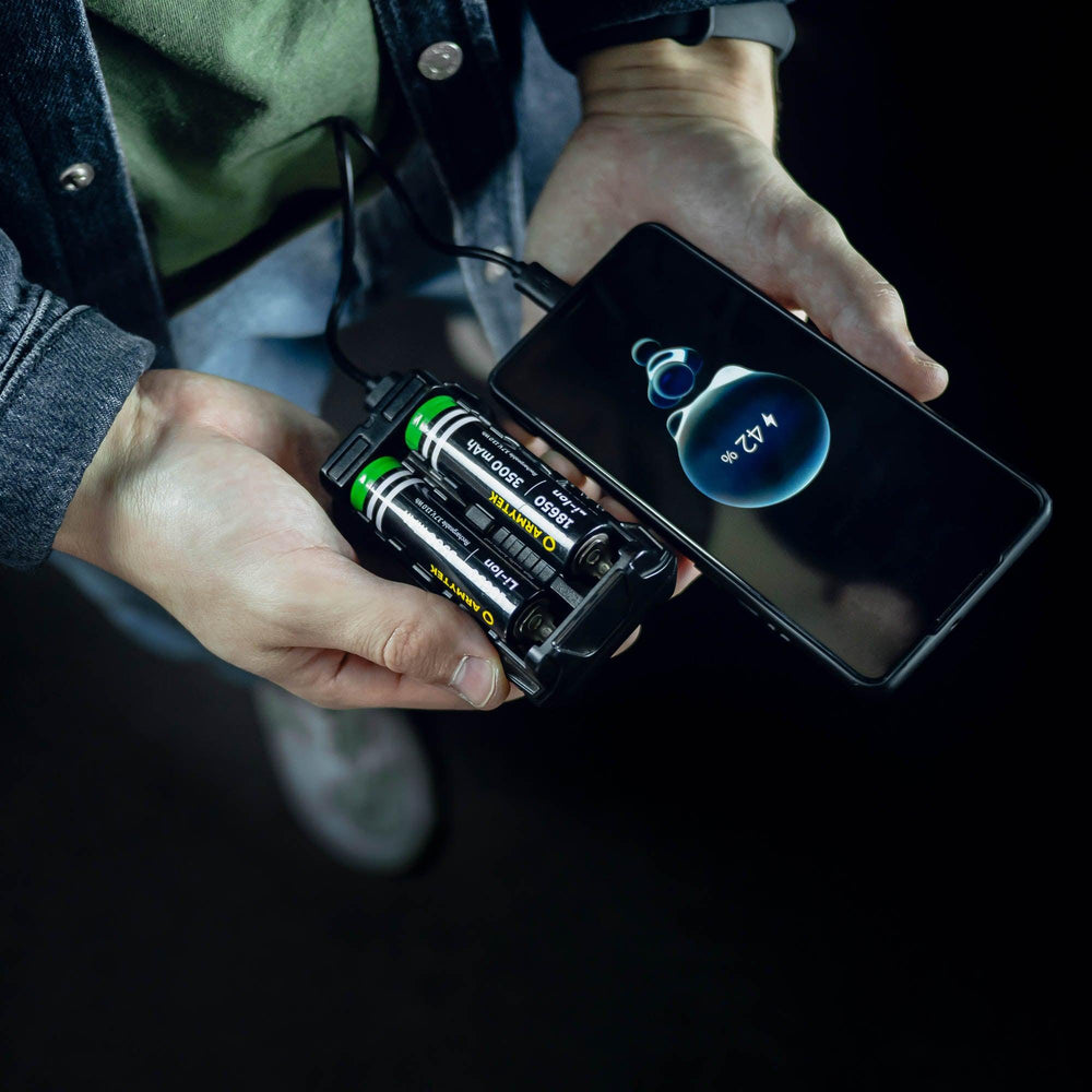 Durch die kompakte Grösse ist die leistungsstarke Vape Edition ideal für das ständige Mitführen. Die Powerbank-Funktion ermöglicht das Aufladen beliebiger Geräte unterwegs. Das spezielle Design des Ladegeräts verhindert, dass die Batterien herausfallen, was besonders praktisch ist, wenn es als Powerbank verwendet wird. Das Design ermöglicht einen zuverlässigen Transport von Batterien ohne zusätzliche Silikonstreifen.