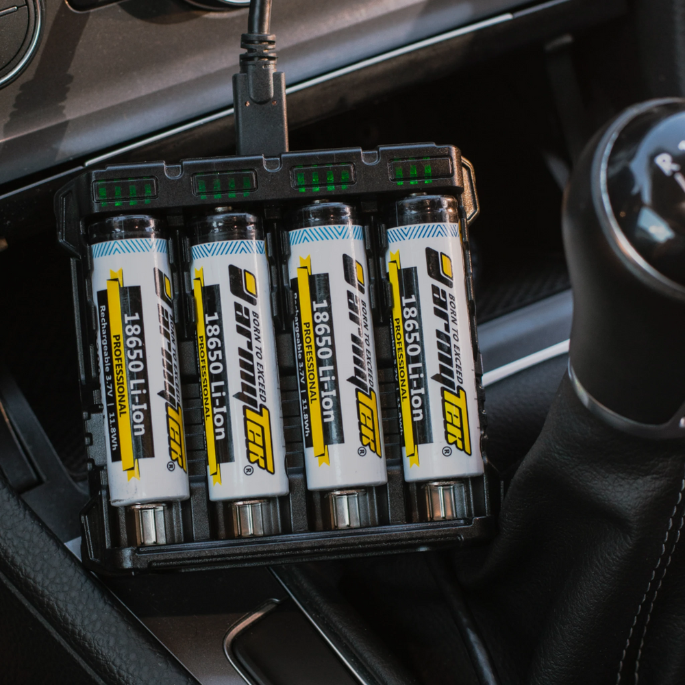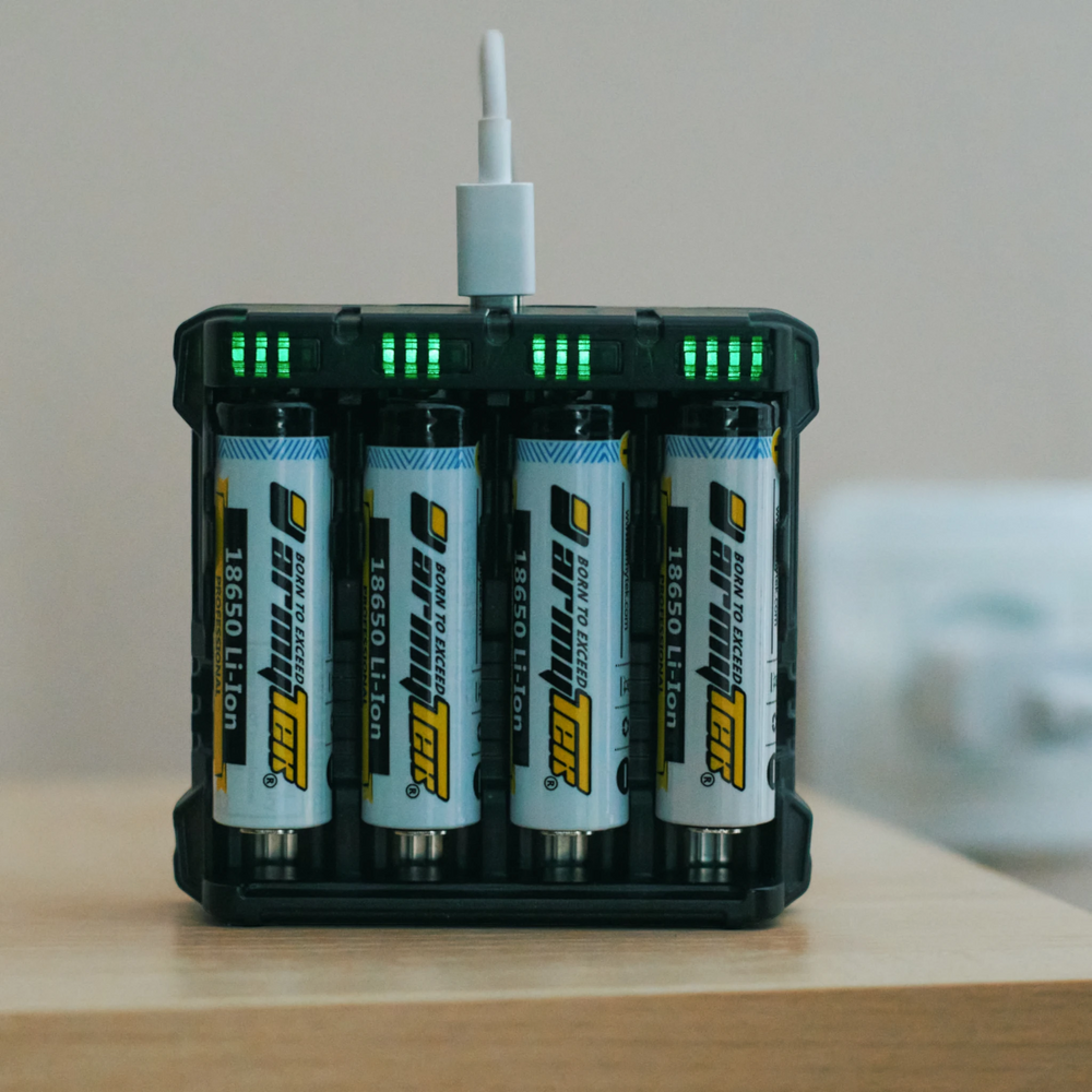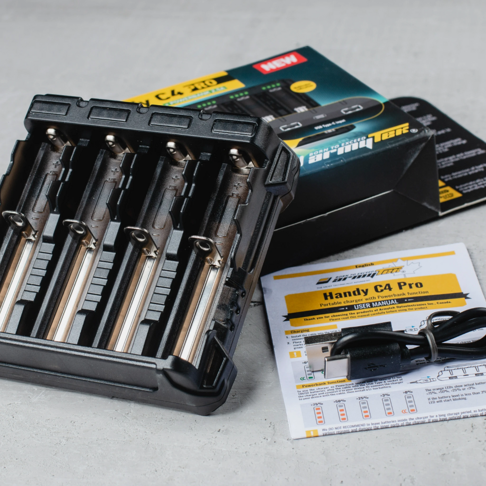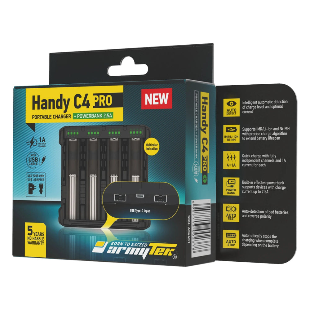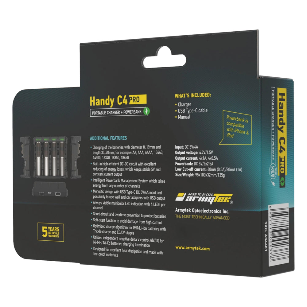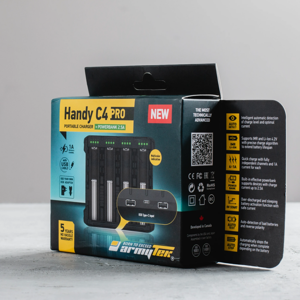 Handy C4 Pro ist ein tragbares Ladegerät für 4 Akkus. Die Powerbank-Funktion unterstützt Geräte mit einem Ladestrom von bis zu 2,5A und ist kompatibel mit iPhone & iPad. Das intelligente Powerbank Management System nimmt Energie aus einer beliebigen Anzahl von Kanälen auf und sorgt so für maximale Effizienz. Zusätzlich ist das Ladegerät hergestellt aus nicht brennbarem Material.