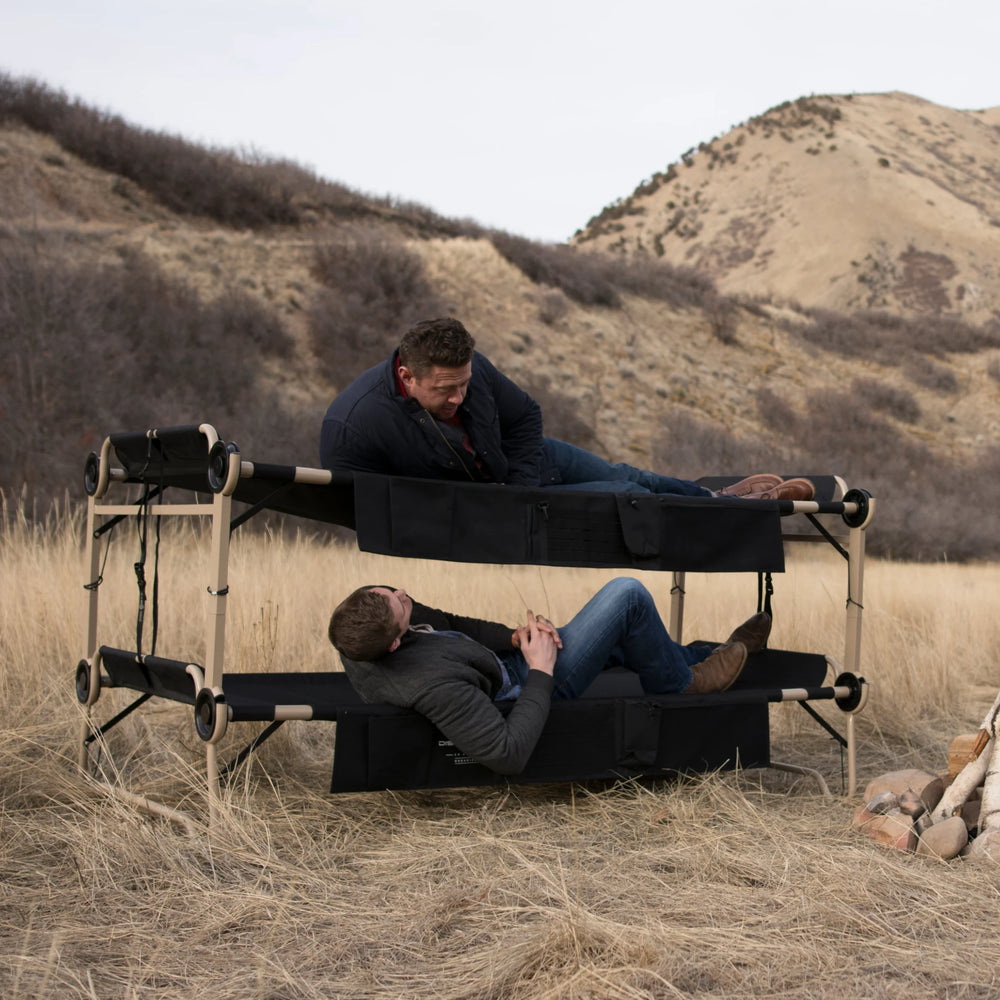 Das Disc-O-Bed Feldbett XXL ist das grösste Modell der Serie und bietet selbst grossen Personen maximalen Komfort beim Campen oder als Gästebett. Mit einer Liegefläche von 215 x 100 cm und einer Belastbarkeit von 272 kg pro Bett ist es besonders robust und komfortabel. Dank des flexiblen Designs lässt es sich als Etagenbett, zwei Einzelbetten oder als praktische Sitzbank nutzen. Der Aufbau gelingt schnell und ohne Werkzeug dank des patentierten Disc-Systems. In den Seitentaschen verstauen Sie persönliche Dinge griffbereit und halten Ordnung im Zelt. Trotz seiner Grösse ist das Bett in zwei Tragetaschen verpackt und damit gut transportierbar.