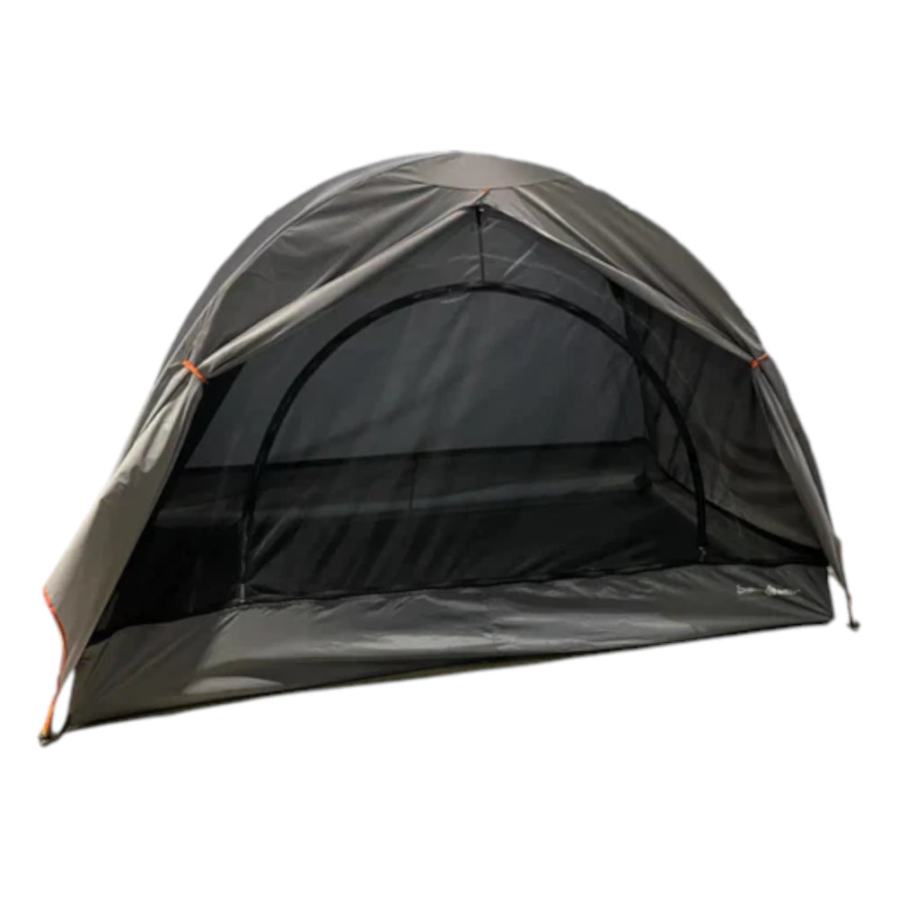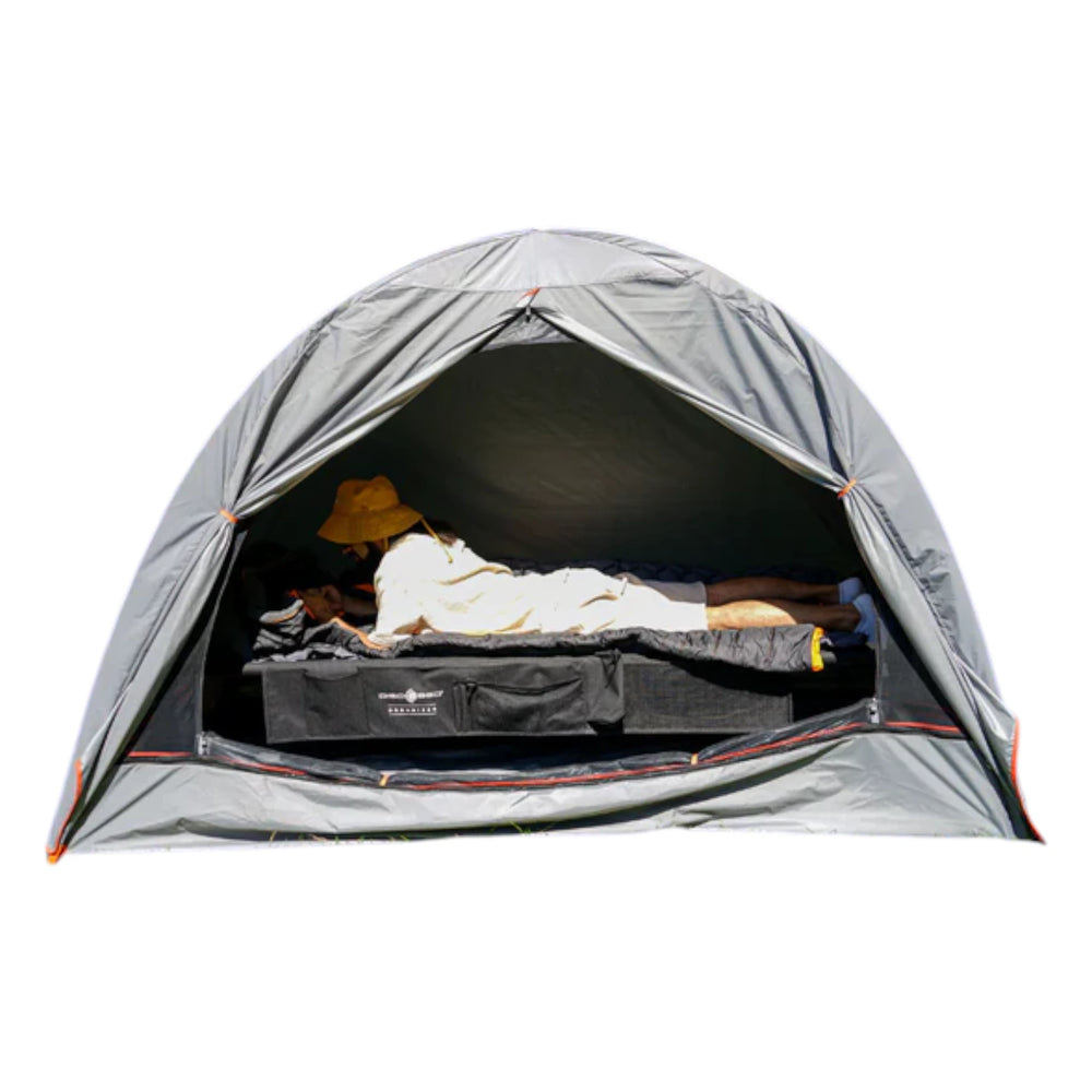 Die Zeltplane ist die ideale Ergänzung für das Disc-O-Bed Mosquito-Tent und macht es zuverlässig wetterfest. Sie bietet Schutz bei Regen und Feuchtigkeit und sorgt so für unbeschwertes Campen bei jedem Wetter. Das strapazierfähige Nylon-Gewebe mit 5.000 mm Wassersäule hält auch starken Regenschauern stand. Die Plane wird einfach über das Mosquito-Tent gezogen und mit Clips am Gestänge befestigt. Zusätzlich sichern Erdnägel die Zeltplane am Boden. Praktisch: Sie passt direkt in die Tasche des Mosquito-Tents und ist damit immer griffbereit.
