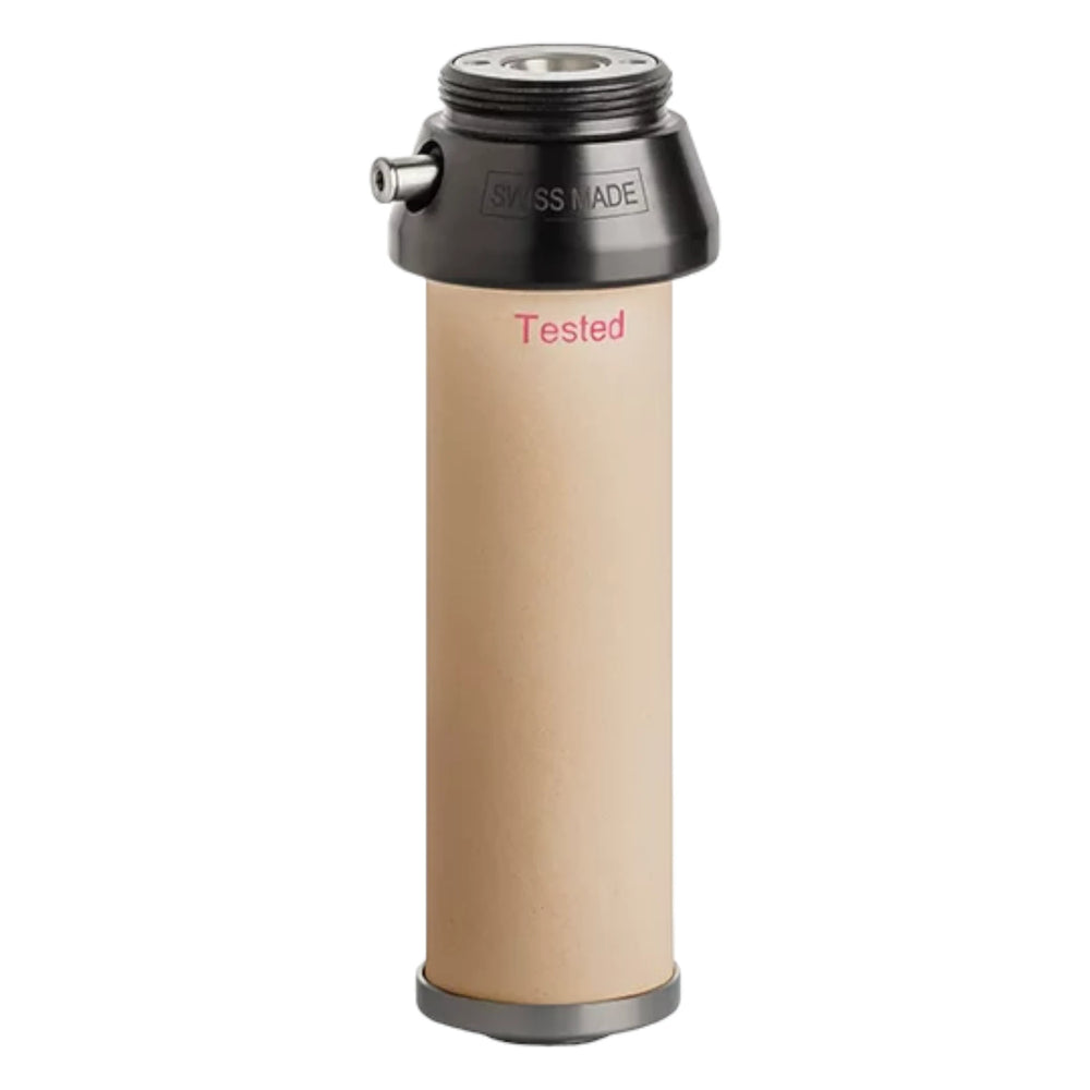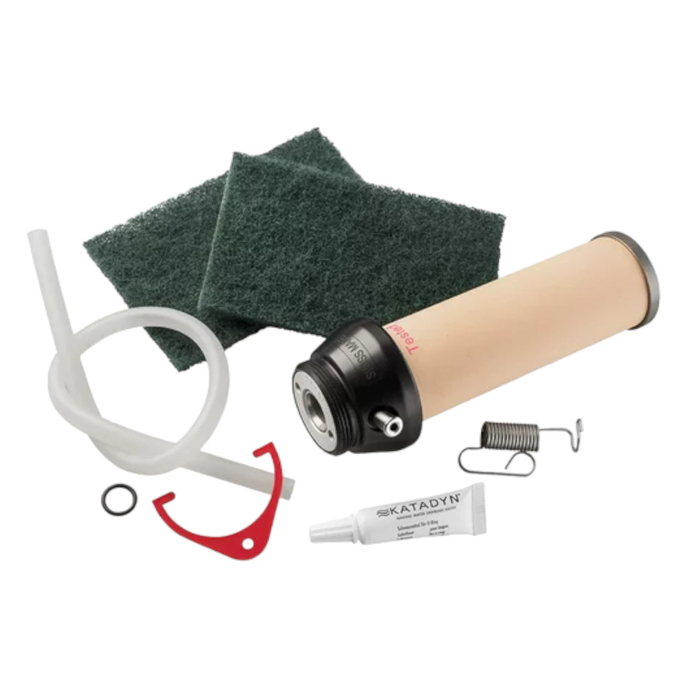 Das Ersatzelement lässt sich einfach in den Katadyn Pocket Filter einsetzen. Regelmäßige Reinigung und die Verwendung der mitgelieferten Masslehre helfen dabei, den optimalen Zeitpunkt für einen Wechsel des Filterelements zu bestimmen. Das Schmiermittel kann verwendet werden, um die Bewegungsteile des Filters geschmeidig zu halten, und die Reinigungspads dienen der Pflege der Keramikoberfläche.
