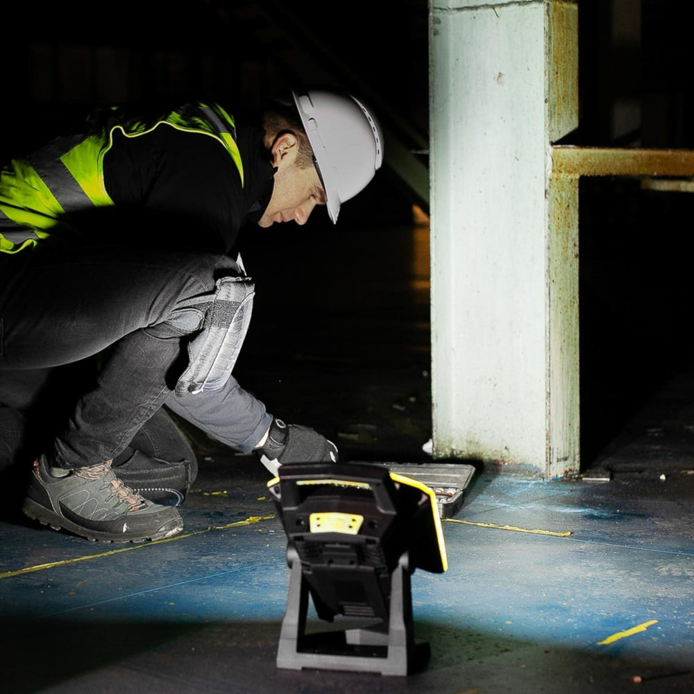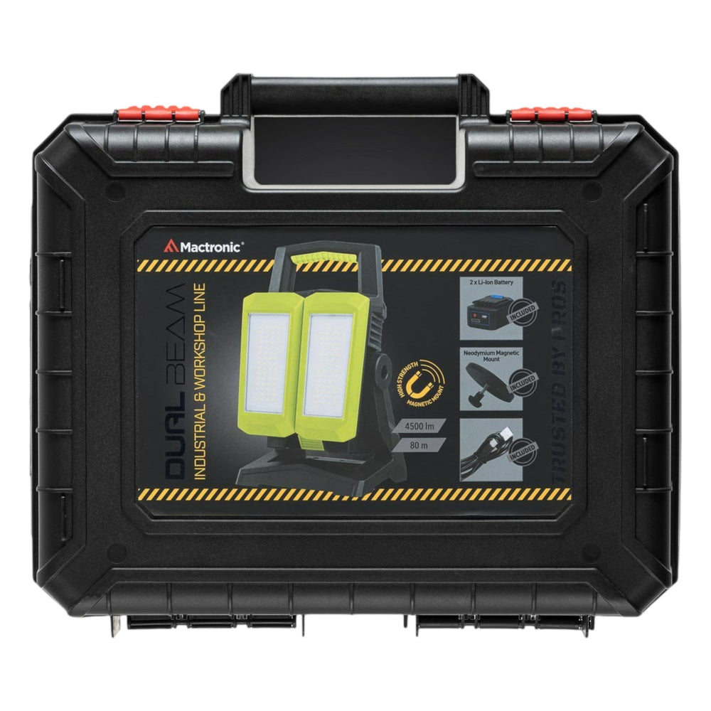 Die Mactronic Dual Beam ist eine extrem leistungsstarke Arbeitsleuchte mit bis zu 4500 Lumen. Zwei unabhängig drehbare Köpfe und ein neigbarer Standfuss sorgen für maximale Flexibilität bei der Ausleuchtung. Vier Lichtmodi ermöglichen den Einsatz von voller Power bis zum Eco-Modus mit bis zu 12 Stunden Laufzeit. Dank Powerbank-Funktion können auch mobile Geräte geladen werden – praktisch für Notfälle oder unterwegs. Mit IP54-Schutz, IK07-Zertifizierung und 2 m Stossfestigkeit ist die Lampe robust und zuverlässig selbst unter harten Arbeitsbedingungen. Ideal für Werkstätten, Baustellen, Feuerwehr oder den Industriebereich.
