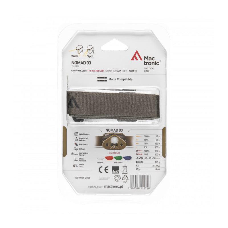 Die Mactronic Nomad 03 ist eine leistungsstarke Stirnlampe, die für Militär, Jäger, Airsoft-Spieler und Outdoor-Enthusiasten entwickelt wurde. Mit einer Lichtleistung von 340 Lumen und einer Reichweite von bis zu 120 Metern sorgt sie für zuverlässige Beleuchtung in jeder Situation. Die rote LED hilft, die Nachtsicht zu erhalten und kann als SOS-Signal dienen. Dank IP64-Zertifizierung ist sie staub- und spritzwassergeschützt, während die robuste Bauweise Stürze aus bis zu 1 Meter Höhe übersteht. Farbfilter, ein Diffusor und eine Helmhalterung machen sie besonders anpassungsfähig für taktische Einsätze und Outdoor-Abenteuer.