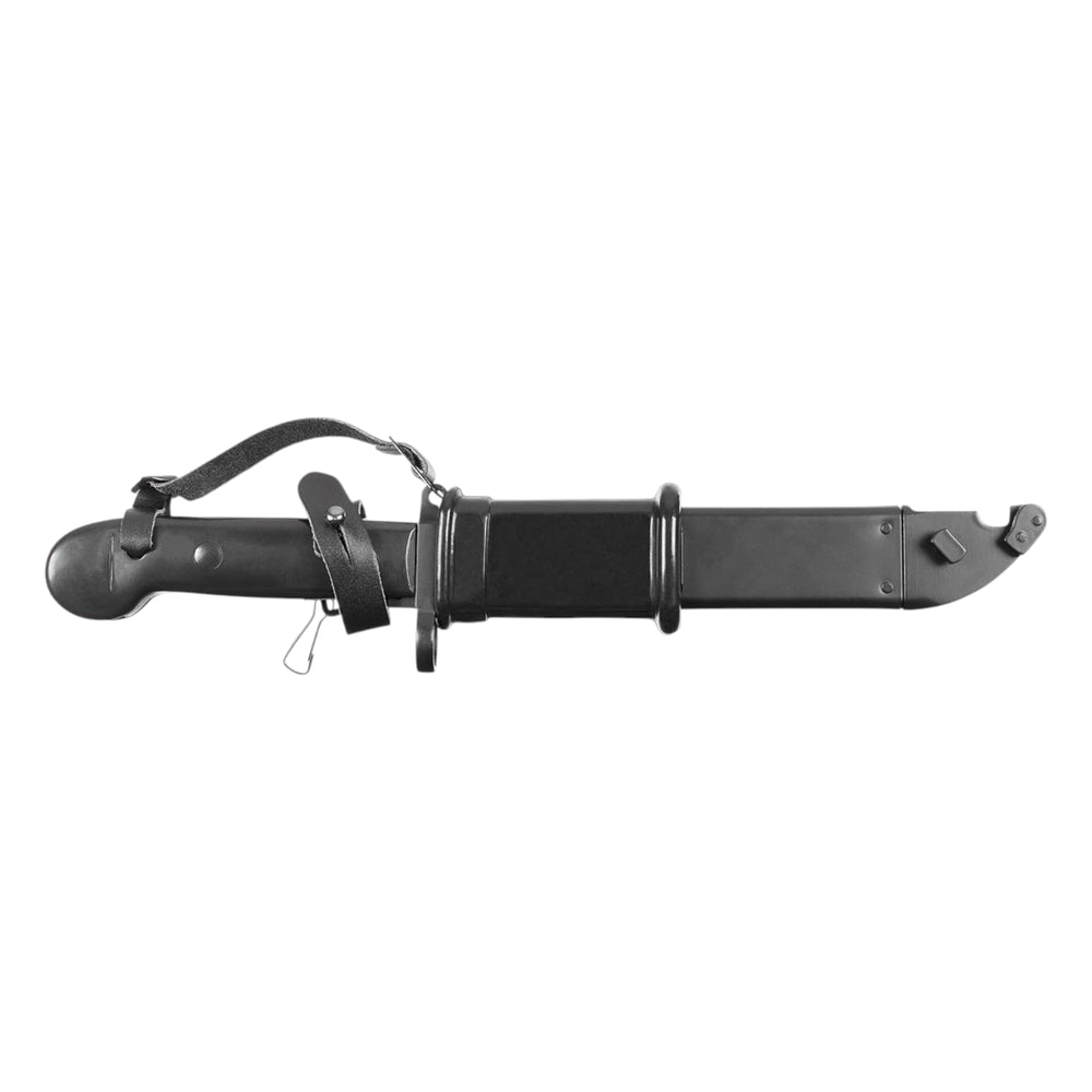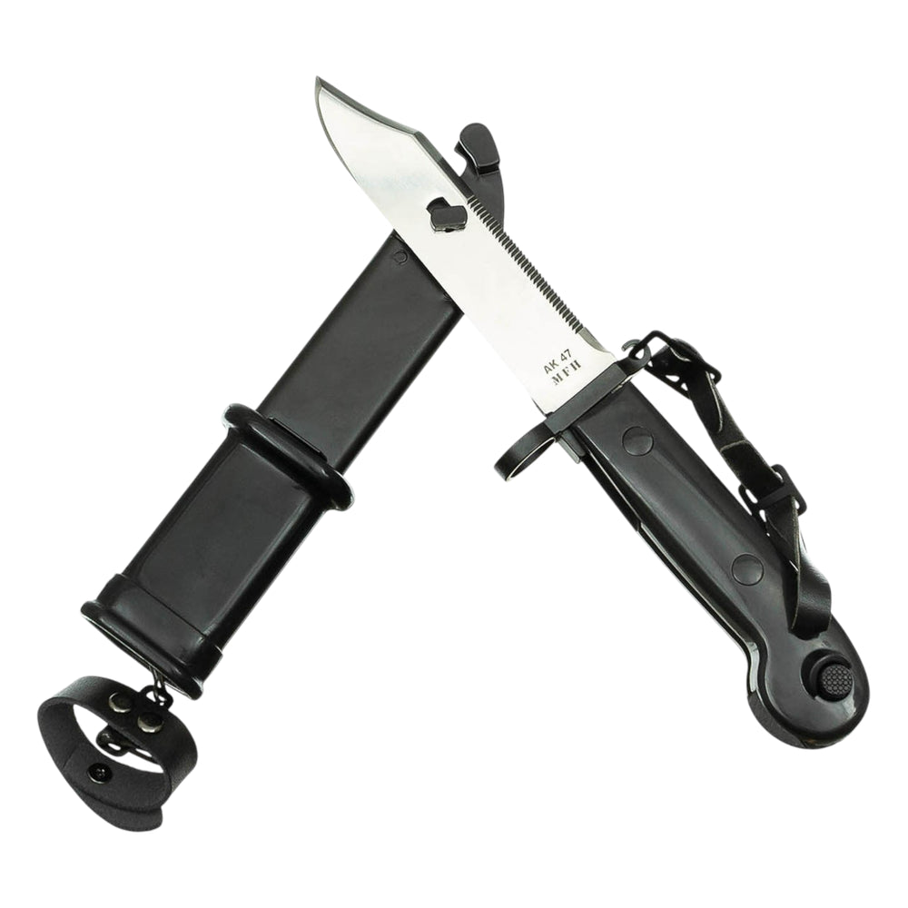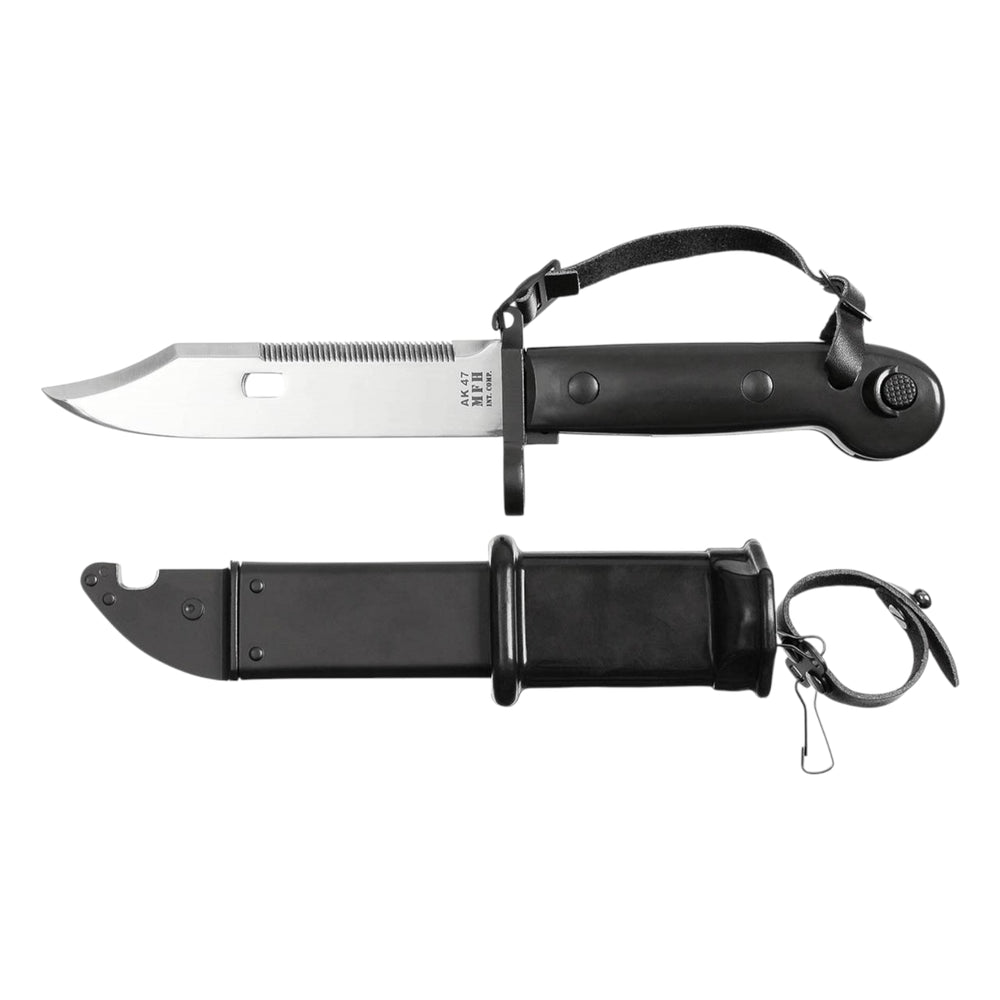 Das MFH Bajonett AK-47 ist ein vielseitiges und robustes Werkzeug, das klassische Militärtechnik mit praktischer Outdoor-Funktionalität verbindet. Die Klinge aus 3Cr13 Stahl verfügt über einen Glattschliff und einen Sägerücken – ideal für verschiedenste Schneidarbeiten. In Kombination mit der Metallscheide lässt sich das Bajonett sogar als Drahtschere verwenden. Die Metallparierstange mit Gewehrlauf-Loch und der Druckknopf am Griff orientieren sich am Originaldesign. Dank Lederbändern kann das Bajonett sicher befestigt werden. Ein funktionales Stück für Sammler, Survival-Enthusiasten und Outdoor-Abenteurer.