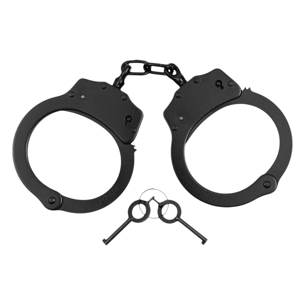 Die vernickelten Handschellen aus Stahl sind ein Klassiker mit "Double Lock". Die Handschellen sind verbunden mit einer Zwischenkette aus zwei verschweissten Gliedern und einem Drehlager. Zusätzlich dazu sind die beiden Schellen symmetrisch. Zum Lieferumfang gehören zwei Schlüssel.
