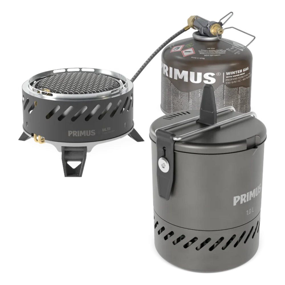 Das Primus Ulti Stove System 1.0L ist ein extrem windfester Hochleistungs-Gaskocher für anspruchsvolle Outdoor- und Expeditionsabenteuer. Der innovative Brenner ohne offene blaue Flamme liefert auch bei starkem Wind, Kälte oder in grosser Höhe zuverlässige Leistung. Mit 3000 W schmilzt und kocht das System effizient Wasser und Schnee für ein bis zwei Personen. Dank tiefem Schwerpunkt und drei stabilen Beinen steht der Kocher sicher auf nahezu jedem Untergrund. Der integrierte Wärmetauscher-Topf sorgt für hohe Effizienz und kurze Kochzeiten. Trotz seiner Leistung bleibt das System kompakt und leicht zu transportieren.