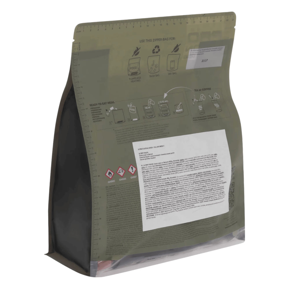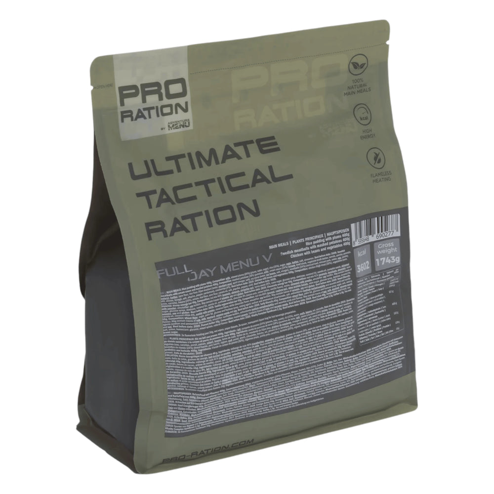 Das Pro-Ration Ultimate Tactical Ration Full-Day Menu V ist eine umfassende Tagesration für eine Person, ideal für den Einsatz in extremen Situationen oder auf Outdoor-Abenteuern. Die Ration enthält drei vollwertige, gefriergetrocknete Mahlzeiten und eine Vielzahl von Snacks, die in einer wasserdichten Folientasche verpackt sind. Mit einer ausgewogenen Mischung aus Hauptgerichten, Snacks und Getränken bietet diese Ration alles, was Sie für einen ganzen Tag benötigen.
