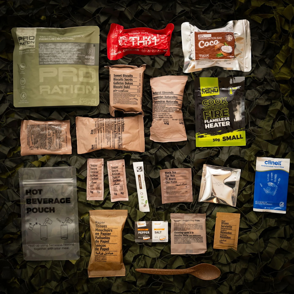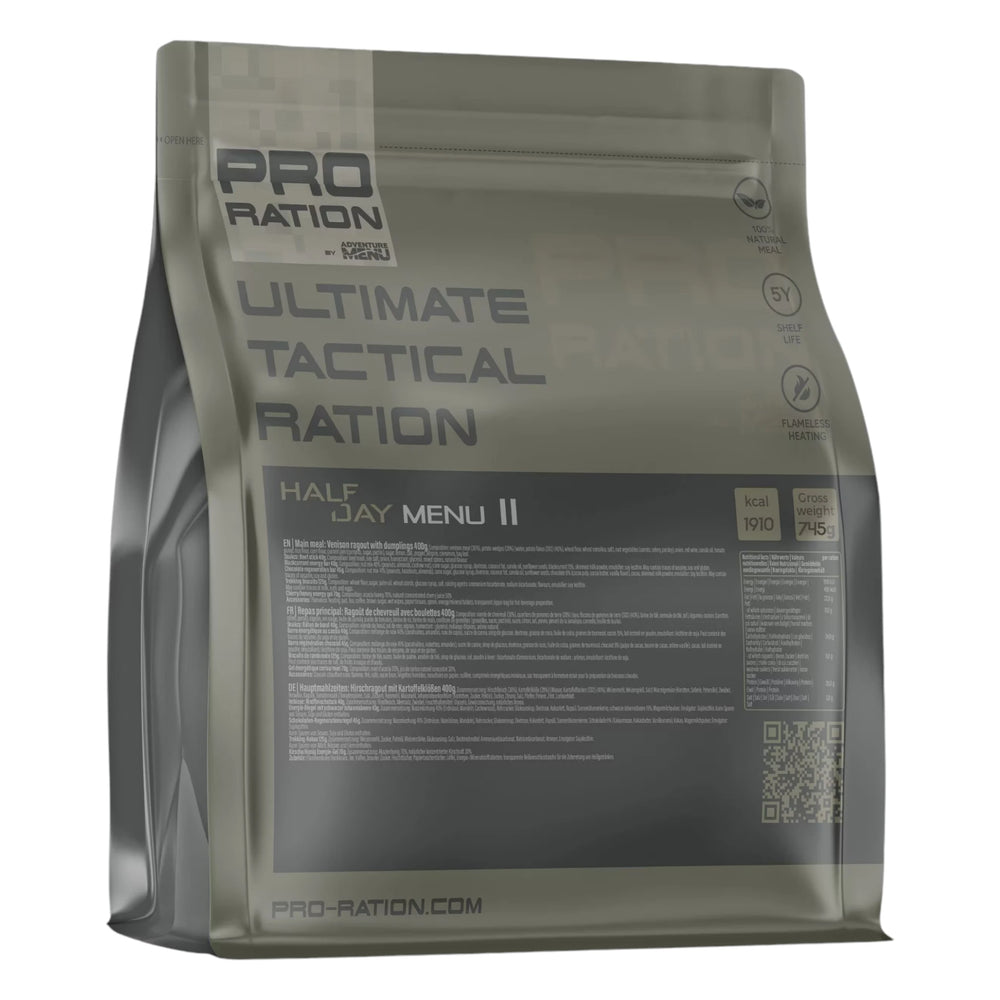Das Pro-Ration Ultimate Tactical Ration Halbtagesmenü II bietet eine ausgewogene Mischung aus nahrhaften Mahlzeiten und Snacks, ideal für anspruchsvolle Outdoor-Aktivitäten oder lange Arbeitseinsätze. Dieses kompakte und leicht transportierbare Set versorgt dich mit allen notwendigen Nährstoffen und sorgt dafür, dass du unterwegs gut versorgt bist. Mit einer schmackhaften Hauptmahlzeit und einer Vielzahl an energiereichen Snacks ist es die perfekte Lösung für unterwegs.