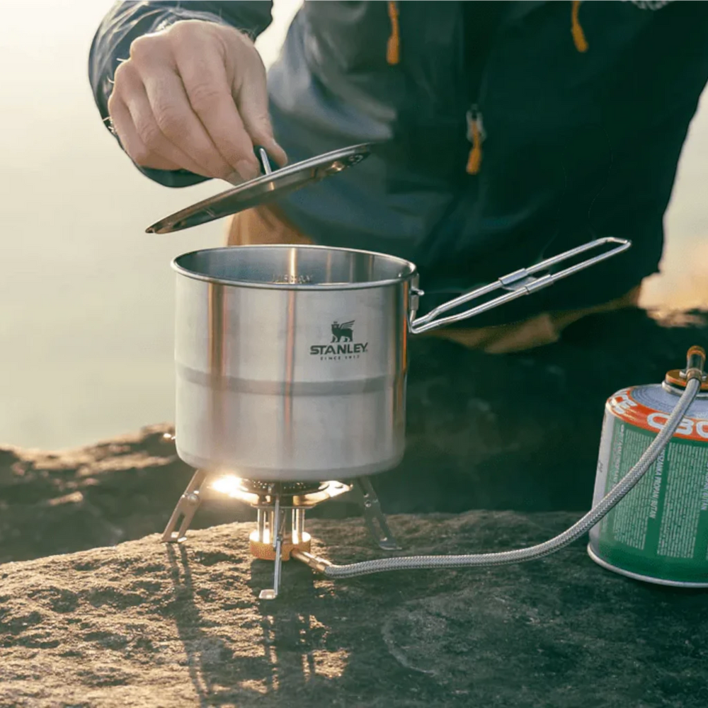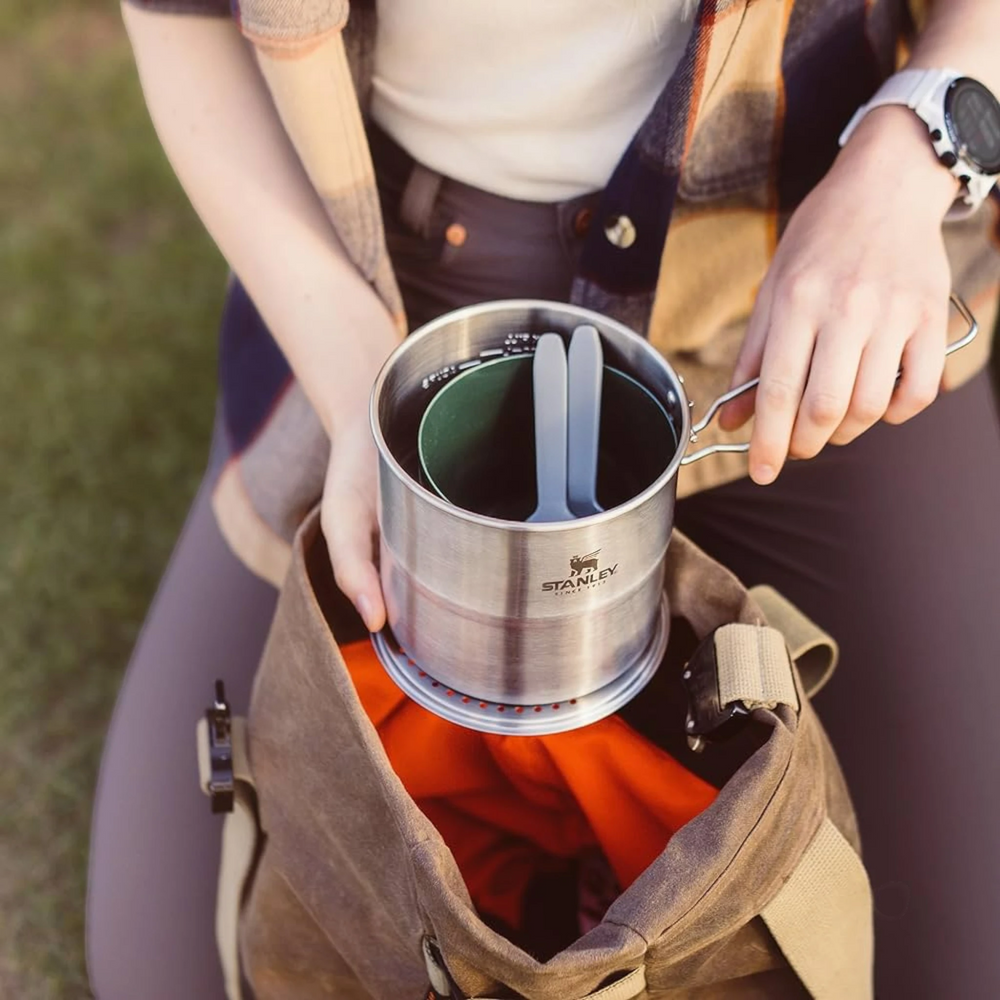 Das STANLEY Adventure Stainless Steel Cook Set ist ideal für Outdoor-Küchenliebhaber, die Wert auf Qualität und Funktionalität legen. Dieses 6-teilige Kochset besteht aus einem 1,0-Liter-Edelstahltopf, der sich hervorragend für die Zubereitung von Mahlzeiten am Lagerfeuer oder auf dem Campingkocher eignet. Das Set umfasst zwei 354-mL-Schalen und zwei Sporks, was es perfekt macht, um Essen zu zweit zu geniessen. Der verlängerbare und verriegelbare Topfgriff sorgt für stabiles Kochen, während das gesamte Set ineinander passt, was den Transport und das Verstauen erleichtert. Das Kochset ist aus 18/8 Edelstahl gefertigt, rostfrei, kratzfest und spülmaschinenfest.