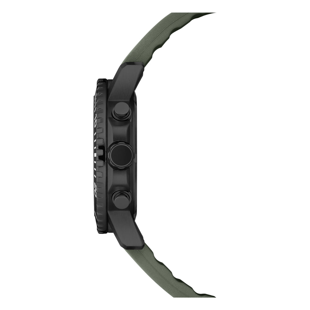 Material Gehäusematerial: Edelstahl, PVD-beschichtet, Gehäusefarbe: Schwarz, Zifferblattfarbe: Grün (Sunray), Glas: Kratzfestes Saphirglas, Armbandmaterial: Kautschuk (Rubber), Armbandfarbe: Grün, Uhrwerk: Solar Chronograph, RONDA Solartech Cal 2040.D, Herkunft: Swiss Made, in der Schweiz gefertigt