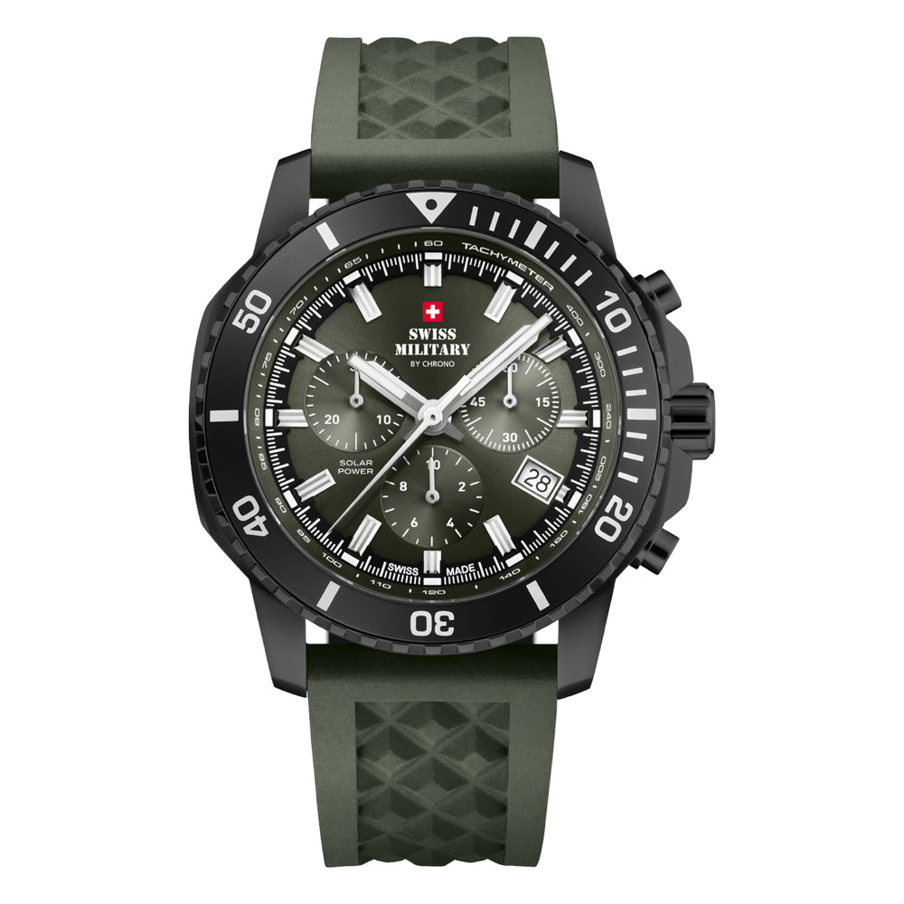 Die Swiss Military SM34113.06 überzeugt mit starkem Farbkontrast und innovativer Solartechnologie. Das grüne Sunray-Zifferblatt mit Leuchtzeigern trifft auf ein widerstandsfähiges Edelstahlgehäuse mit schwarzer PVD-Beschichtung – für einen modernen, markanten Look. Die Uhr wird komplett durch Licht betrieben und bietet bis zu 5 Monate Laufzeit, auch im Dunkeln. Kratzfestes Saphirglas und eine drehbare Aluminium-Lünette schützen bei aktiven Einsätzen. Das grüne Kautschukarmband mit Easy-Click-System lässt sich schnell gegen ein Metallband tauschen. Mit 100 m Wasserdichtigkeit begleitet dich dieser Solar Chronograph zuverlässig im Alltag und beim Abenteuer.