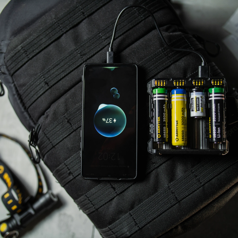 Handy C4 Pro ist ein tragbares Ladegerät für 4 Akkus. Die Powerbank-Funktion unterstützt Geräte mit einem Ladestrom von bis zu 2,5A und ist kompatibel mit iPhone & iPad. Das intelligente Powerbank Management System nimmt Energie aus einer beliebigen Anzahl von Kanälen auf und sorgt so für maximale Effizienz. Zusätzlich ist das Ladegerät hergestellt aus nicht brennbarem Material.