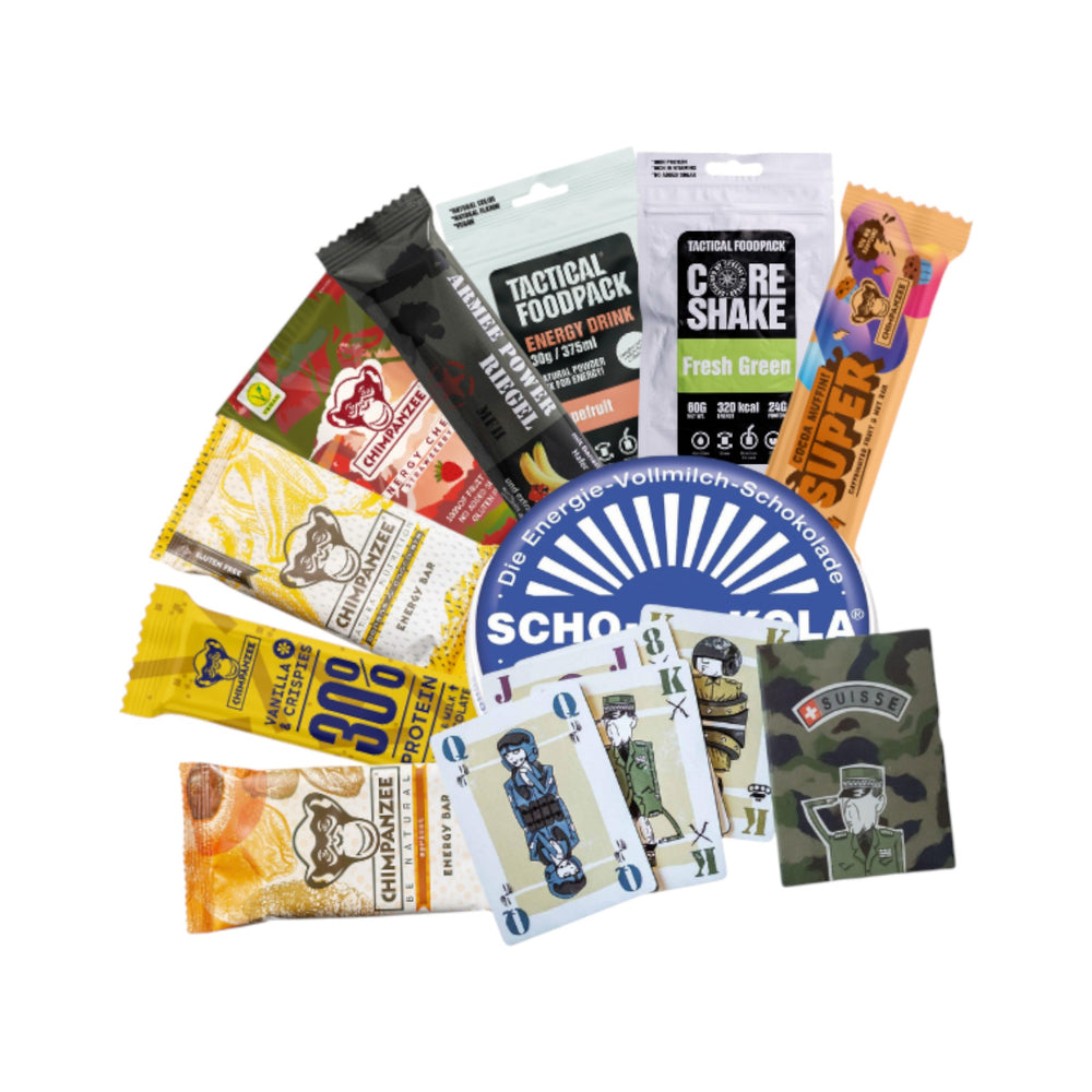 Das Fresspäckli "Light" ist das perfekte Aufmunterungsgeschenk für Rekruten in der RS. Mit 10 ausgewählten Artikeln sorgt es für Energie, Motivation und ein Stück Heimat im Alltag der Armee. Ob süss, nahrhaft oder spielerisch – von Schokolade über Energy Riegel bis zur Jasskarte ist alles dabei. Das beigelegte Energy Drink Pulver bringt den nötigen Kick für anstrengende Tage. Du kannst das Päckli direkt mit Feldpost-Adresse an den Empfänger senden – ganz unkompliziert beim Checkout. Schenke Freude und mach einem Soldaten oder einer Soldatin eine besondere Überraschung.
