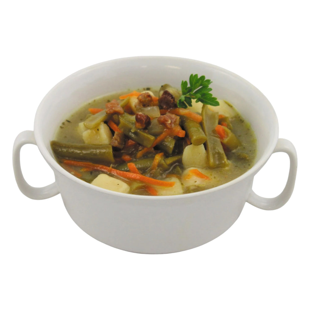Der MFH Bohneneintopf mit Speck ist eine schmackhafte und ausgewogene Mahlzeit, die mit hochwertigen, heimischen Zutaten überzeugt. Handwerklich in Deutschland gefertigt, enthält der Eintopf 37,5 % grüne Bohnen, ergänzt durch Karotten, Kartoffeln und eine leichte Würze. Der Speckanteil sorgt für ein herzhaftes Aroma, während auf Konservierungsmittel, Geschmacksverstärker und Separatorenfleisch verzichtet wird. Glutenfrei und mit einer Haltbarkeit von bis zu 10 Jahren ist diese Konserve perfekt für Outdoor-Abenteuer, Notvorräte oder den schnellen Genuss zu Hause.