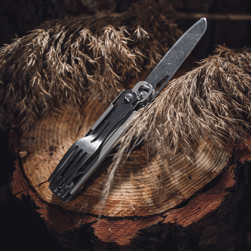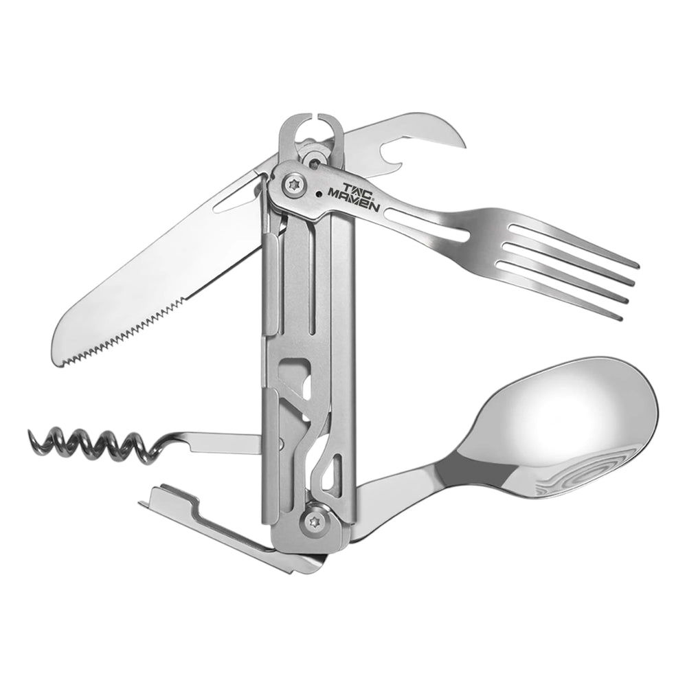 • 6-in-1 Bestecktool: Messer, Löffel, Gabel, Flaschenöffner, Dosenöffner, Korkenzieher