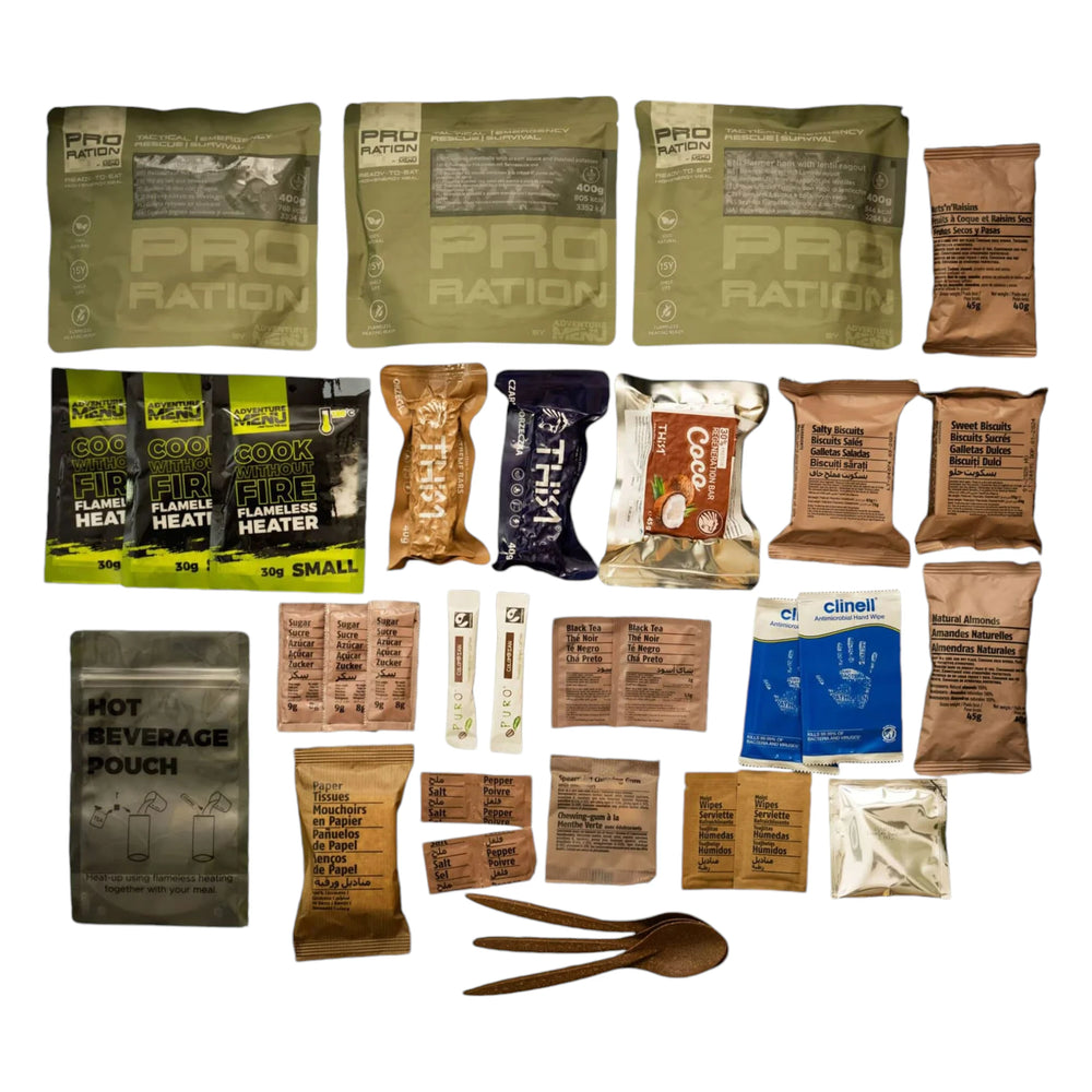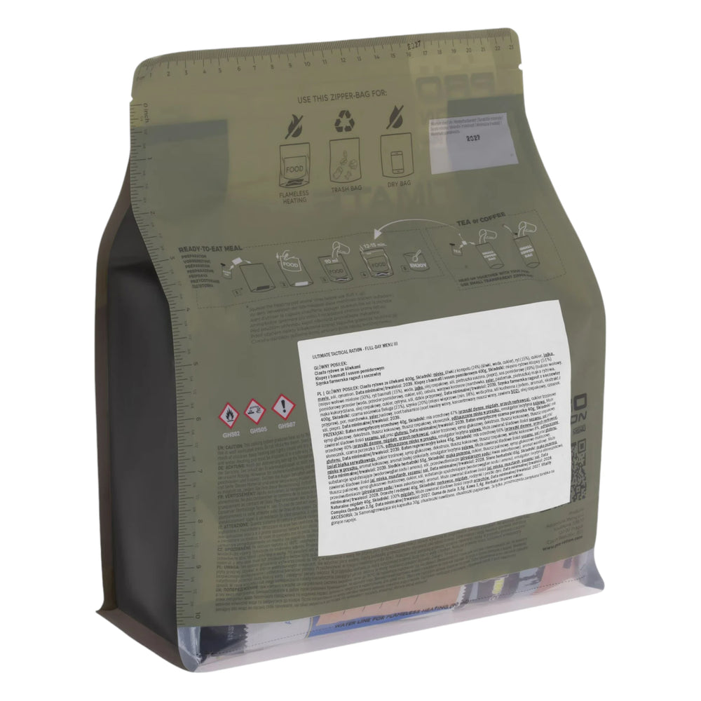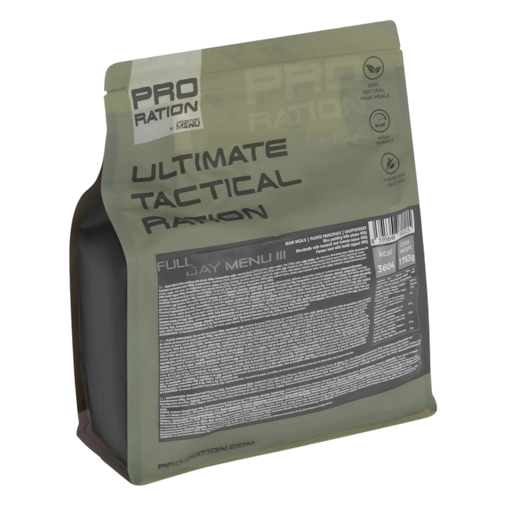 Das Pro-Ration Ultimate Tactical Ration Tagesmenü III bietet eine vollständige Verpflegungslösung für einen ganzen Tag, perfekt für anspruchsvolle Outdoor-Aktivitäten oder lange Einsätze. Es enthält drei schmackhafte warme Mahlzeiten sowie eine Auswahl an energiereichen Snacks, die den gesamten Tag über für ausreichende Nährstoffzufuhr sorgen. Dank der flammenlosen Heizkissen lassen sich die Mahlzeiten problemlos unterwegs erwärmen.