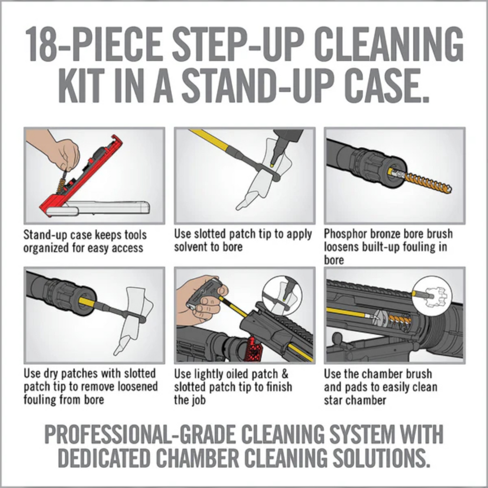 Das Real Avid Bore Max Speed Clean Upgrade Set ist ein professionelles 18-teiliges Reinigungsset für alle, die ihre AR15 gründlich und effizient pflegen möchten. Mit dabei ist ein 74 cm langer, teilbarer Reinigungsstab aus Messing sowie eine ergonomische Multifunktionsgriffeinheit für präzises und komfortables Arbeiten. Spezialisierte Bürsten für Lauf und Verschlusskammer sorgen für eine effektive Entfernung von Rückständen und Verschmutzungen. Alle Komponenten sind ordentlich in einem bruchsicheren, aufrecht stehenden Etui verstaut – perfekt für Werkbank oder Range-Bag. Ein durchdachtes Komplettsystem für ambitionierte AR15-Besitzer.
