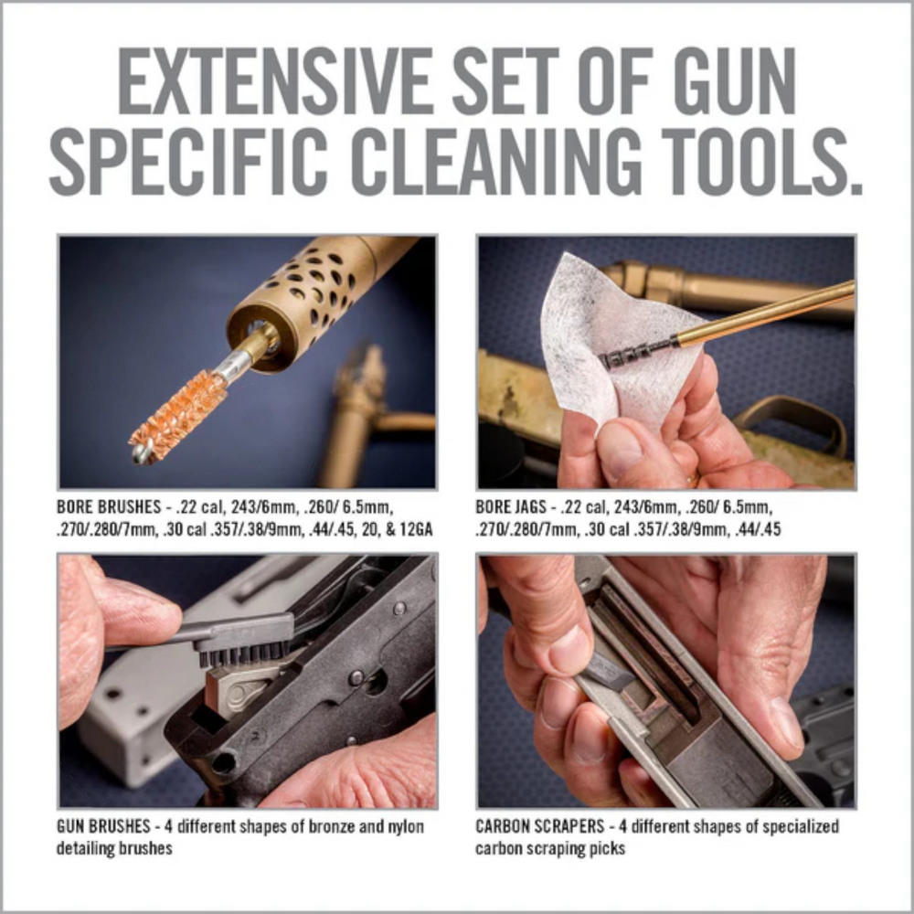 Abmessungen Geeignet für: Kurzwaffen (.22–.45), Langwaffen, Schrotflinten (12/20 GA), Reinigungsmatte: Gepolstert, ölresistent, rutschfest, 109 x 40 cm, Reinigungsstäbe: Messing, verlängerbar bis 81 cm
