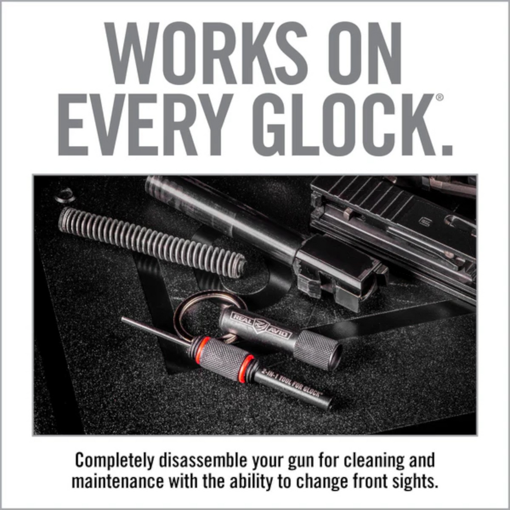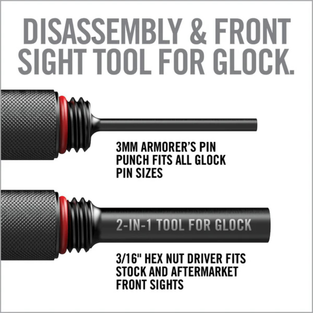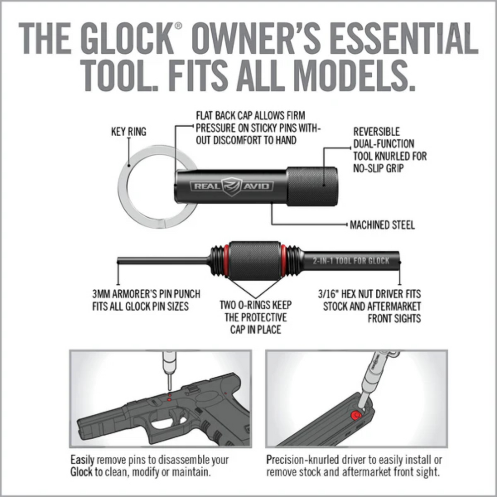 Das Real Avid 2-in-1 Tool für Glock ist ein kompaktes Spezialwerkzeug, das speziell für Wartung und Modifikationen an Glock-Pistolen entwickelt wurde. Mit dem integrierten Front Sight Tool kannst du das Korn präzise montieren oder entfernen – egal ob serienmässig oder nachgerüstet. Die gehärtete Ausstossnadel eignet sich ideal zum Entfernen von Pins beim Zerlegen der Waffe. Der rutschfeste, gerändelte Griff sorgt für sicheren Halt und präzises Arbeiten. Klein, praktisch und unverzichtbar für alle Glock-Besitzer. Perfekt für Werkbank, Schiessstand oder das Einsatzgepäck.