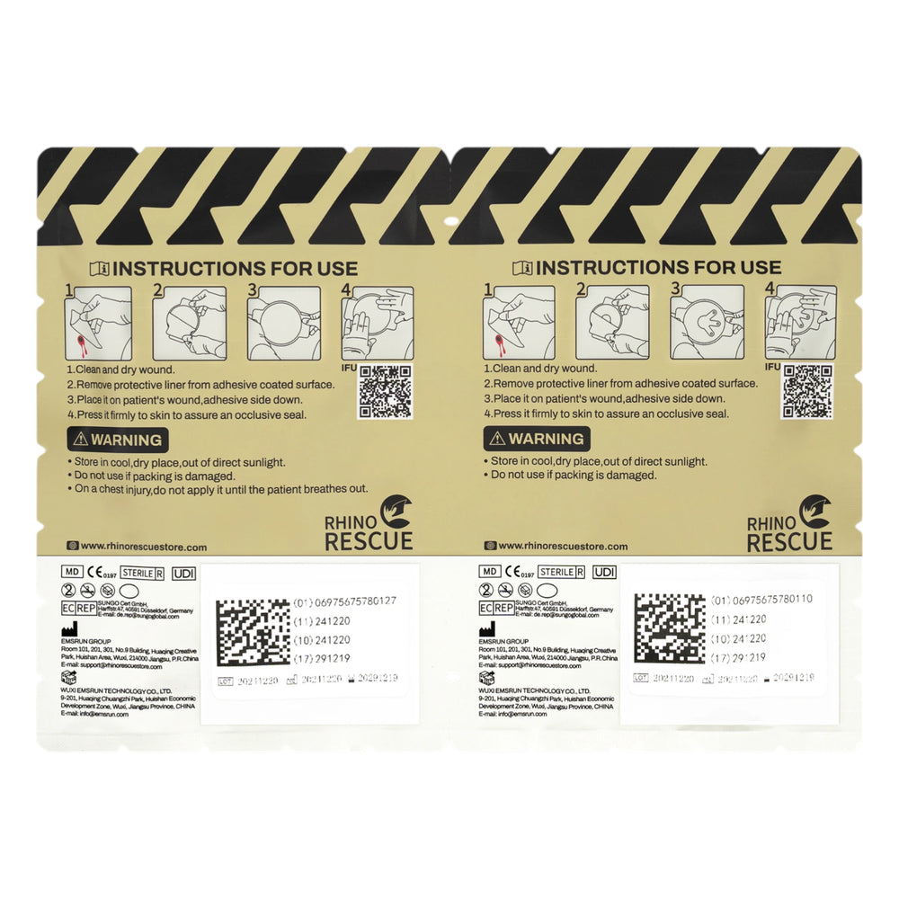 Der Rhino Rescue Chest Seal ist ein okklusiver Brustverschluss zur Versorgung von offenen Thoraxverletzungen. Er hilft, einen Spannungspneumothorax zu verhindern und kann so in Notfallsituationen Leben retten. Das 3 Vent Design ermöglicht das Entweichen von Luft beim Ausatmen, während das Eindringen beim Einatmen blockiert wird. Der medizinische Hydrogel Kleber sorgt für starken Halt, auch auf nasser, behaarter oder blutiger Haut. Dank transparenter Rückseite und zwei Grifflaschen ist eine schnelle Anwendung und Kontrolle der Wunde möglich. Kompakt verpackt eignet er sich ideal für IFAK, Trauma Kit oder taktische Ausrüstung.