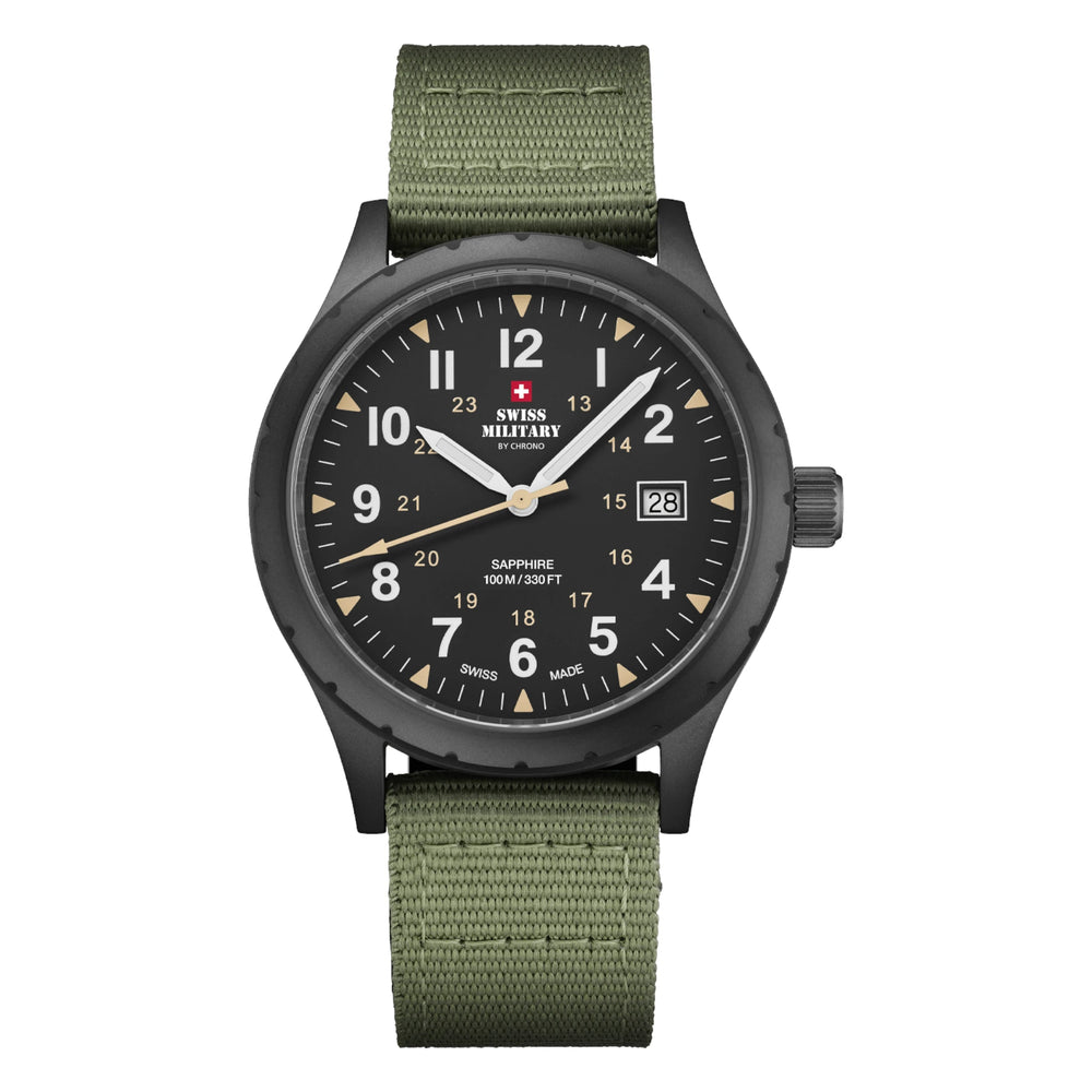 Die Swiss Military SM34108.07 ist eine klassische Field-Watch im Army-Stil, die Funktionalität und robustes Design ideal vereint. Ihr matt schwarzes Zifferblatt mit leuchtenden Ziffern und Militärzeitanzeige sorgt für optimale Ablesbarkeit bei Tag und Nacht. Das sandgestrahlte Edelstahlgehäuse mit schwarzer PVD-Beschichtung verleiht der Uhr eine markante, taktische Optik und schützt gleichzeitig zuverlässig vor Abnutzung. Ein grünes Canvas-Armband mit Lederdetails rundet den Look ab und bietet angenehmen Tragekomfort – auch im Einsatz. Dank Schweizer Quarzwerk, kratzfestem Saphirglas und 100 m Wasserdichtigkeit ist die Uhr ein zuverlässiger Begleiter bei jedem Abenteuer.