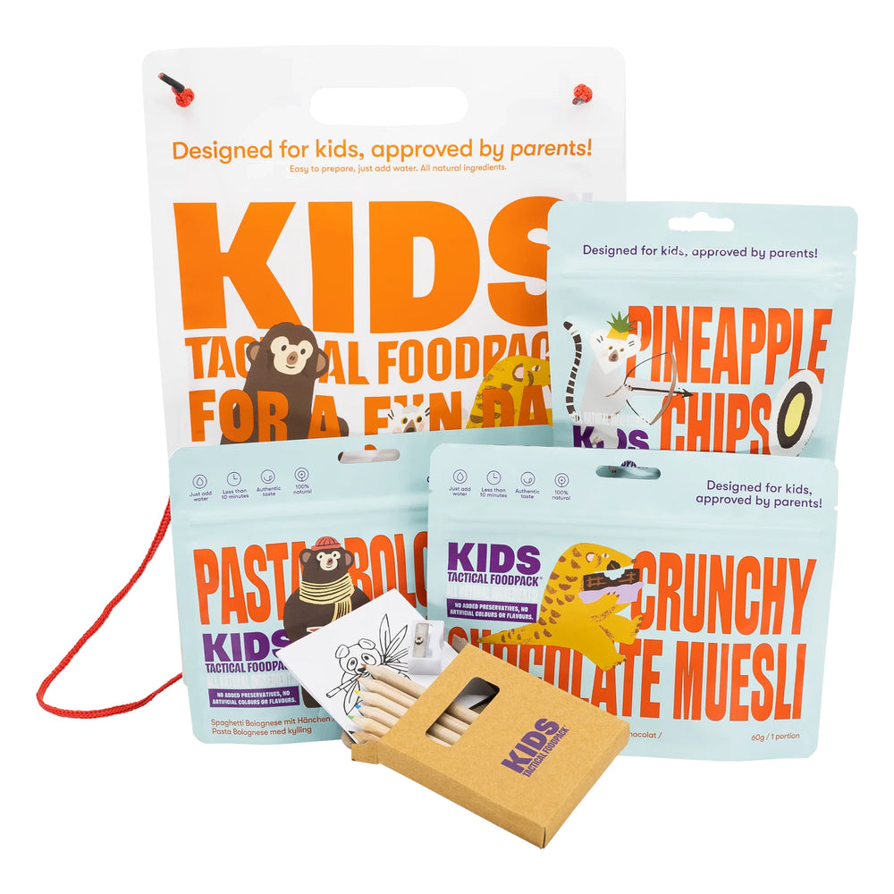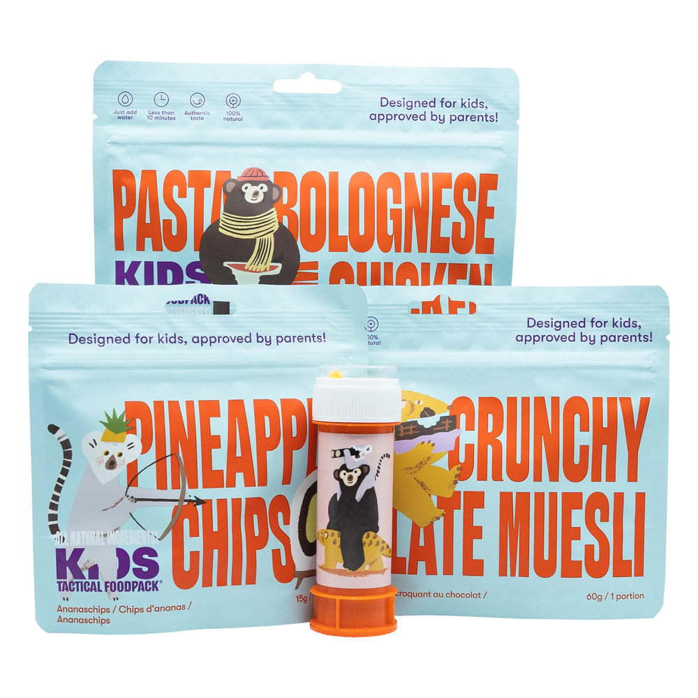Das KIDS Combo RIVER ist das ideale 1-Tages-Outdoor-Paket für Kinder – mit Frühstück, Hauptmahlzeit, Snack und einer spannenden Überraschung. Die ausgewählten Gerichte sind kinderfreundlich, einfach zuzubereiten und voller natürlicher Zutaten. In einer verspielten und handlichen Verpackung geliefert, bietet das Set köstliche und energiereiche Mahlzeiten, die kleine Entdecker für den Tag stärken. Dank der gefriergetrockneten Zubereitung bleiben Geschmack und Nährstoffe optimal erhalten.