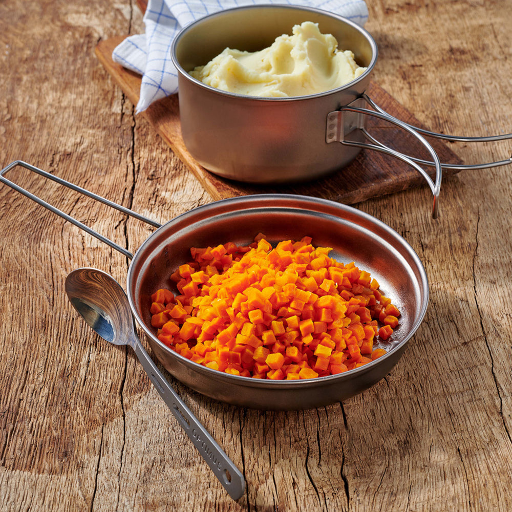 Die Trek’n Eat Karottenwürfel bringen natürliche Süsse und Farbe in deine Outdoor-Küche. Hergestellt aus frisch geernteten Karotten, schonend blanchiert und getrocknet, sind sie ideal für Suppen, Eintöpfe oder Salate. In wenigen Minuten zubereitet, lassen sie sich einfach wie frisches Gemüse verwenden. Die 400-g-Dose ergibt rund 6 Liter fertige Portionen – perfekt für längere Touren oder den Notvorrat. Mit 15 Jahren Haltbarkeit und rein pflanzlicher Zusammensetzung sind sie eine wertvolle Ergänzung für jedes Abenteuer. Einfach, nährstoffreich und vielseitig einsetzbar.