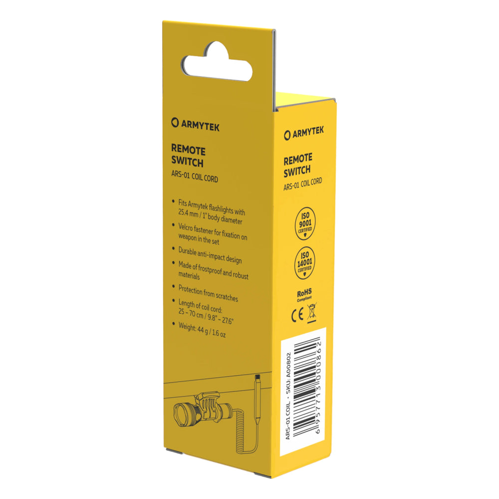 Der Armytek ARS-02 Kabelfernschalter ist ein zuverlässiges Zubehör, das speziell für den Einsatz mit taktischen Taschenlampen entwickelt wurde, die an Waffenläufen oder Fahrradlenkern befestigt sind. Mit einem flexiblen Spiralkabel, das eine Länge von 25 bis 70 cm abdeckt, ermöglicht er eine bequeme und schnelle Fernbedienung der Taschenlampe. Der Schalter bietet eine geräuschlose Momentlicht-Funktion und ist aus robusten Materialien gefertigt, um den anspruchsvollen Bedingungen im Einsatz standzuhalten.