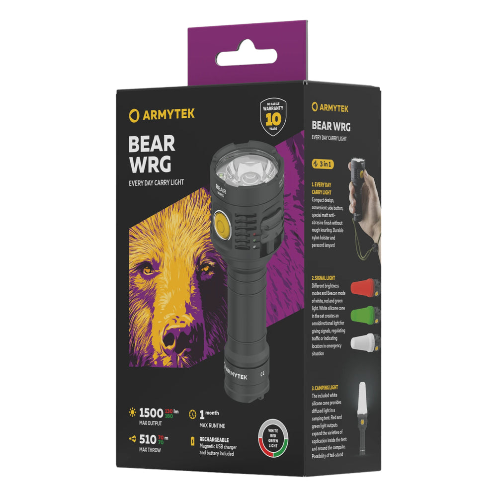 Die Armytek Bear WRG ist eine vielseitige EDC-Taschenlampe mit weissem, rotem und grünem Licht, ideal für den täglichen Gebrauch und spezialisierte Aufgaben. Mit ihrem leistungsstarken weissen Licht ist sie perfekt für das Hervorheben entfernter Objekte, während die roten und grünen Flutlichtstrahlen optimal für den Nah- und Mitteldistanzbereich sind. Die robuste Konstruktion, der weiche Silikon-Kegel für diffuses Licht und die zahlreichen Befestigungsmöglichkeiten machen die Bear WRG zu einem verlässlichen Begleiter für Outdoor-Aktivitäten wie Camping oder Wildbeobachtung.