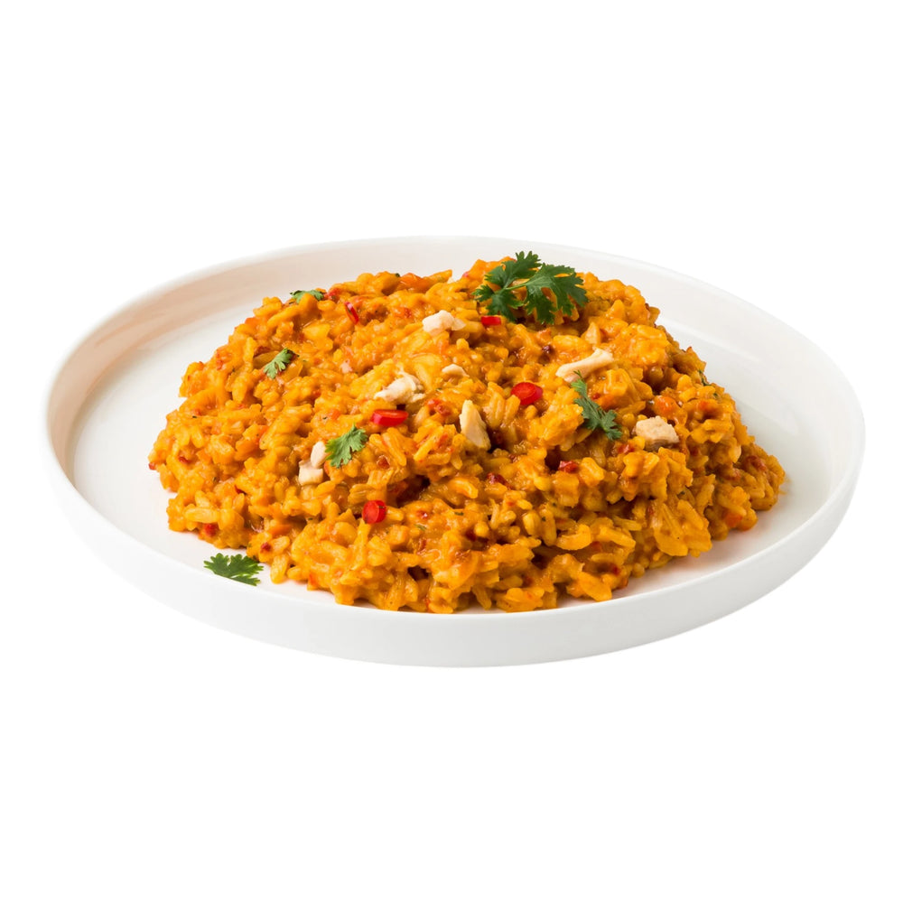 Dieser mexikanisch inspirierte Eintopf bringt würzigen Geschmack in dein Outdoor-Abenteuer. Die Kombination aus Reis, Poulet und aromatischen Gewürzen sorgt für eine kräftige und sättigende Mahlzeit. Gemüse wie Paprika, Tomaten und Karotten runden das Gericht perfekt ab. Ideal, um nach einem langen Tag neue Energie zu tanken. Die Zubereitung erfolgt einfach direkt im Beutel mit heissem Wasser. Leicht, kompakt und perfekt für unterwegs.