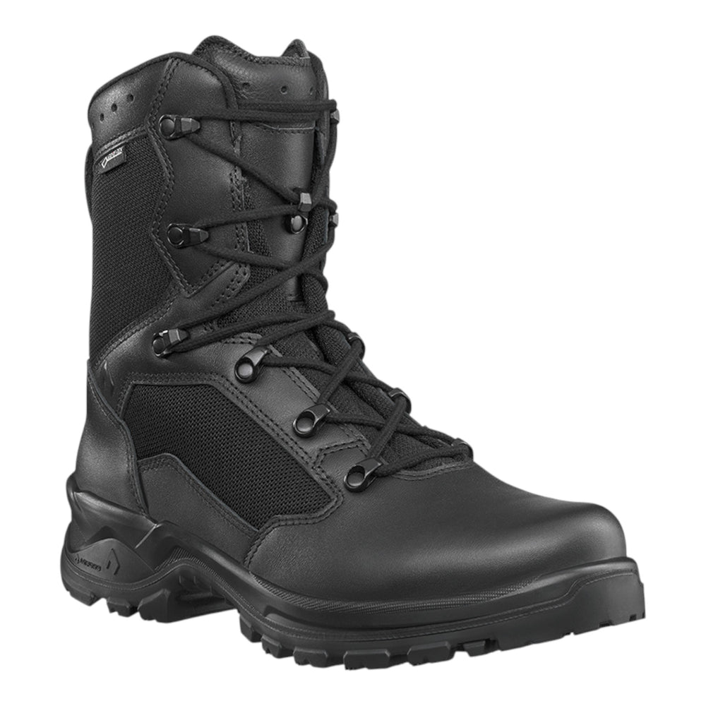 Der Combat GTX Black überzeugt mit einer Kombination aus robustem Waterproof-Leder und strapazierfähigem Textilgewebe. Dank GORE-TEX-Membran ist der Schuh wasserdicht und hoch atmungsaktiv – ideal für den Innen- und Ausseneinsatz. Die Gummi/PU-Sohle mit griffigem Profil bietet optimalen Halt auf verschiedenen Untergründen. Das HAIX Climate System sorgt für ein angenehmes Fussklima, indem Feuchtigkeit nach aussen geleitet wird. Zudem bietet das Arch Support System ergonomische Unterstützung für den Mittelfuss und beugt Fehlstellungen vor. Mit seiner antistatischen Eigenschaft, geringem Gewicht und verstärkten Lederbesätzen ist dieser Stiefel eine zuverlässige Wahl für anspruchsvolle Einsätze.