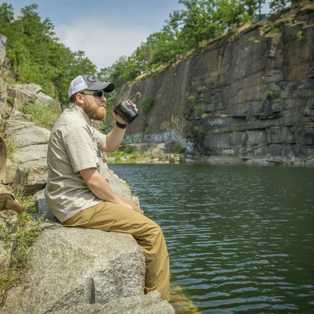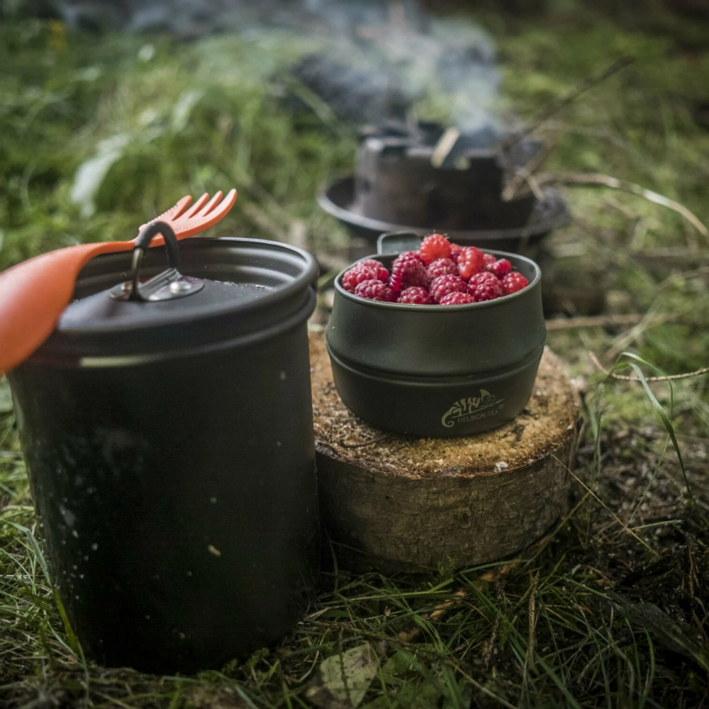 Der Helikon-Tex Camp Cup ist ein grosser, vielseitiger Outdoor-Becher aus hartanodisiertem Aluminium – ideal für heisse Getränke oder kleine Mahlzeiten unterwegs. Dank seiner robusten Bauweise kann er direkt auf dem Gaskocher oder über offenem Feuer erhitzt werden. Der klappbare Griff sorgt für sicheres Handling, während der mitgelieferte Deckel die Temperatur im Inneren länger hält. Besonders praktisch: Der Becher ist so dimensioniert, dass eine 1-Liter-Nalgene-Flasche passgenau hineinpasst – perfekt für platzsparendes Packen im Rucksack. Ein zuverlässiger Begleiter für alle Outdoor-Abenteuer.