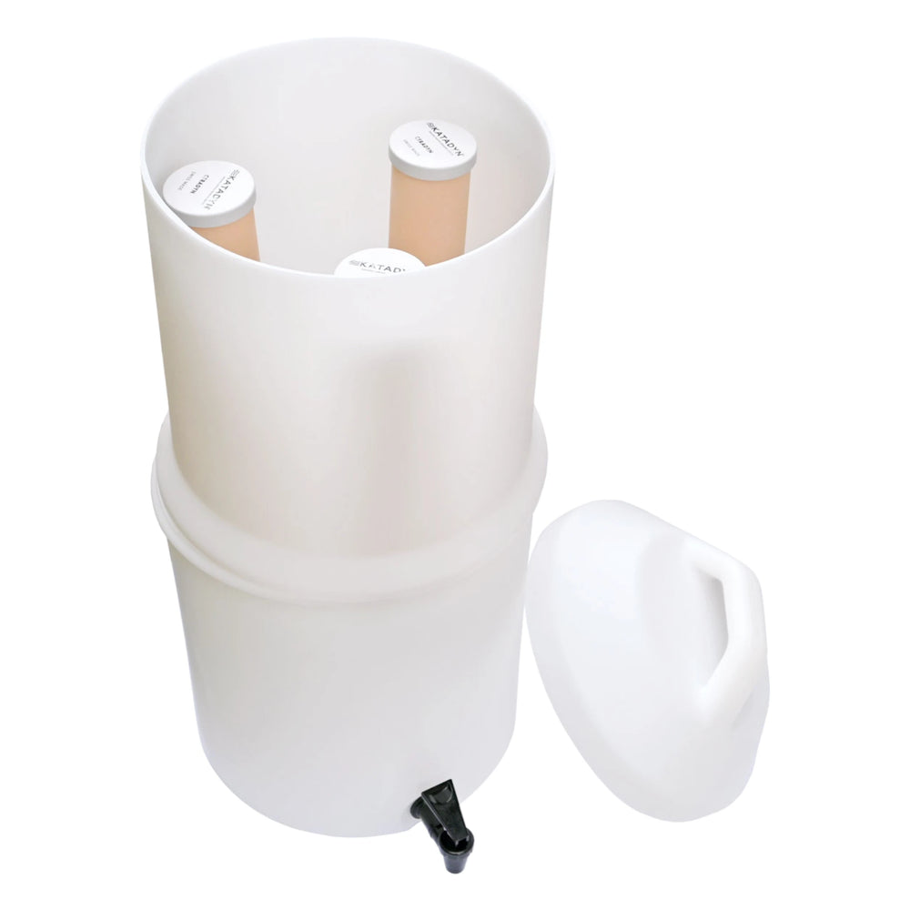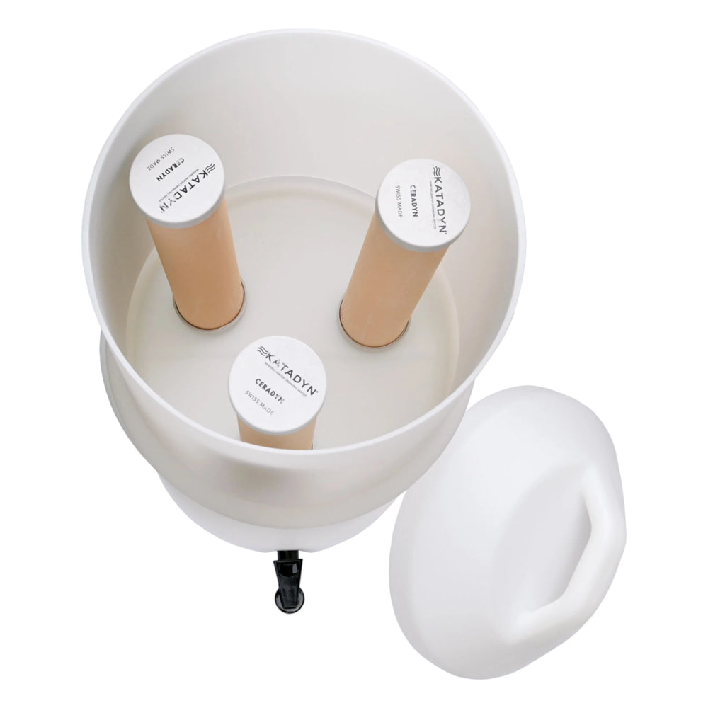 Lieferumfang 1x Drip-Filter-System (2 Behälter, 1 Deckel) 1x Auslasshahn mit Dichtungen und Verschraubung 3x Filterelement Ceradyn 1x Gummi-Stopfen (ersetzt 1 abgenutztes Element) 1x Reinigungspad 1x Masslehre 1x Bedienungsanleitung