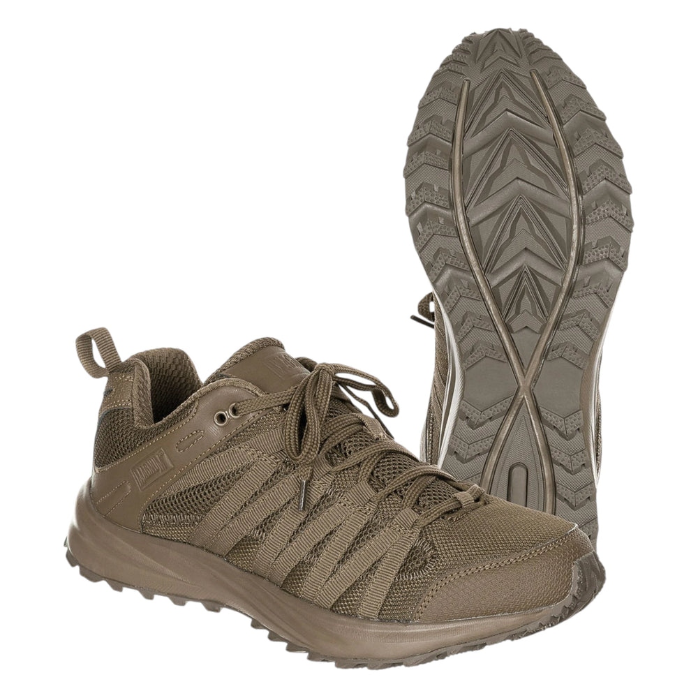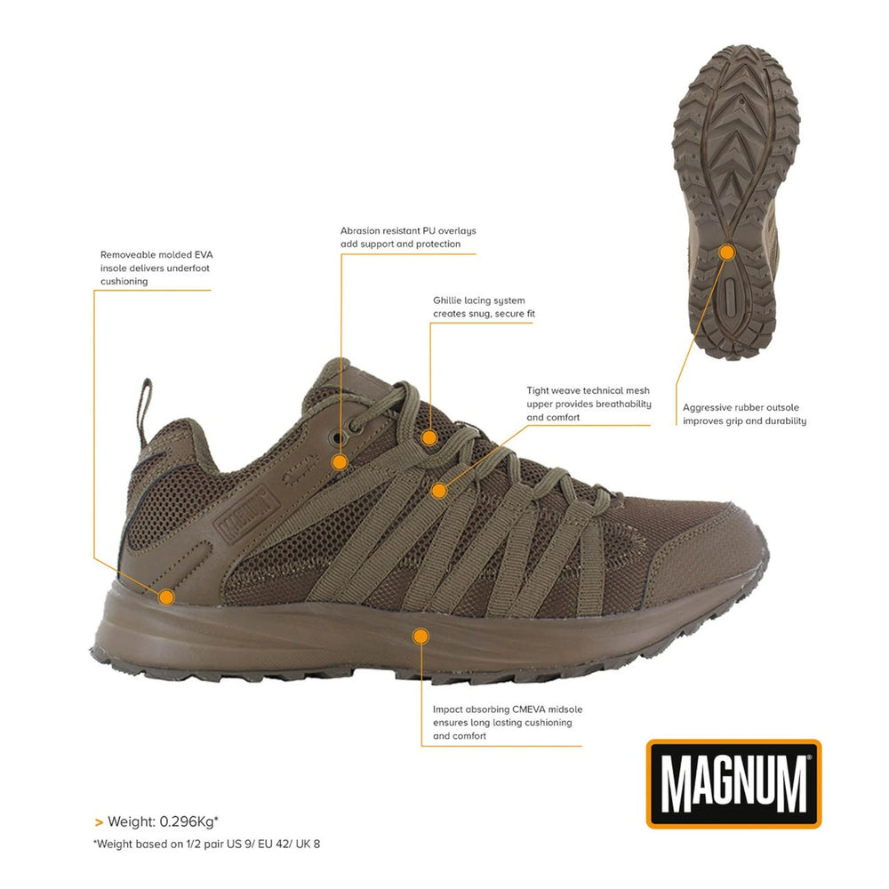Der Magnum Storm Trail Lite Coyote Tan ist ein vielseitiger und extrem leichter Schuh für Outdoor-Abenteuer, taktische Einsätze und den Alltag. Das schnelltrocknende, atmungsaktive Innenfutter sorgt für ein angenehmes Fussklima, während der gepolsterte Schaft und die Zunge zusätzlichen Komfort bieten. Die CMEVA-Zwischensohle gewährleistet optimale Stossdämpfung und entlastet die Gelenke. Für sicheren Halt auf unterschiedlichstem Terrain sorgt die rutschfeste und griffige Gummisohle. Die 5-Loch-Schnürung und die praktische Anziehlasche erleichtern das An- und Ausziehen.