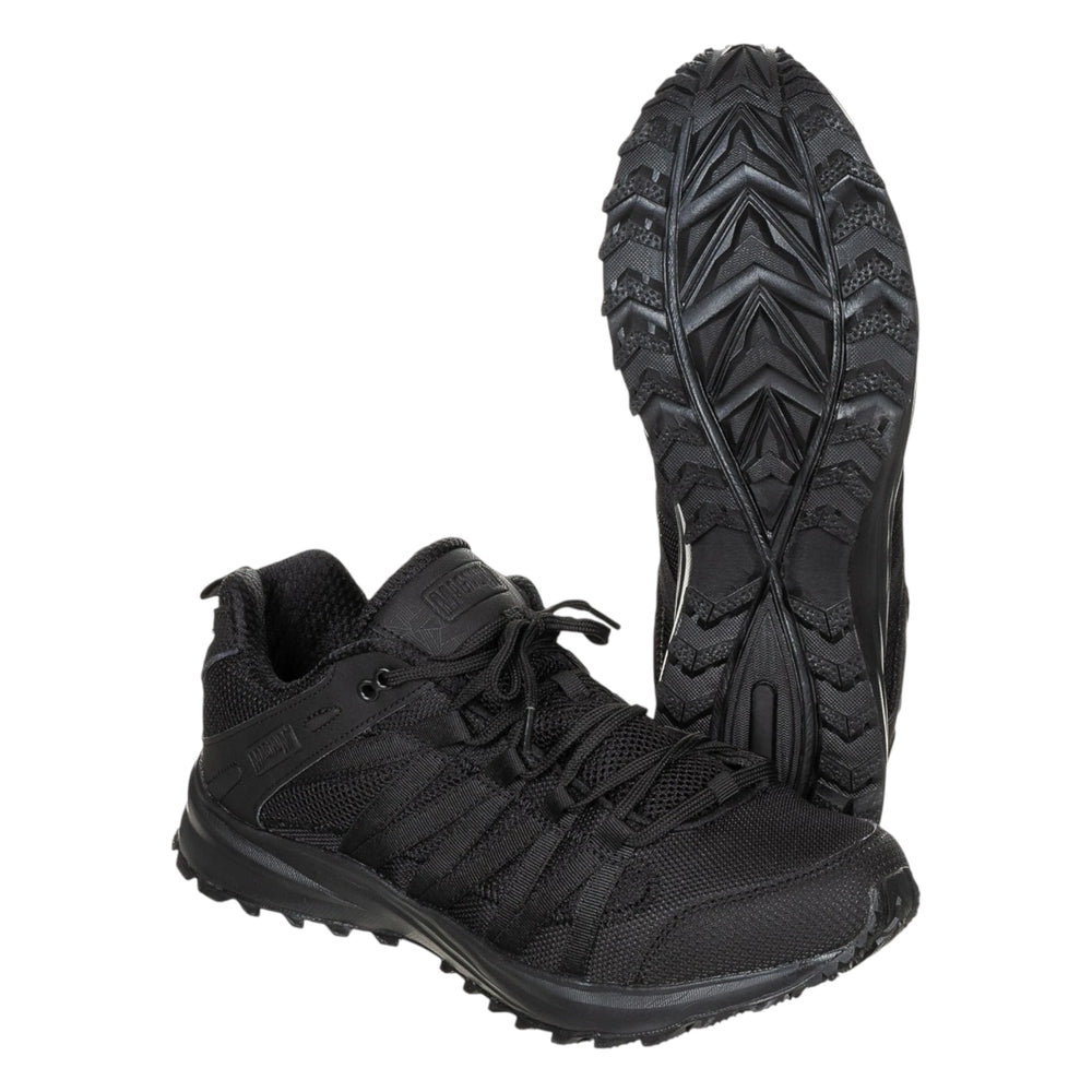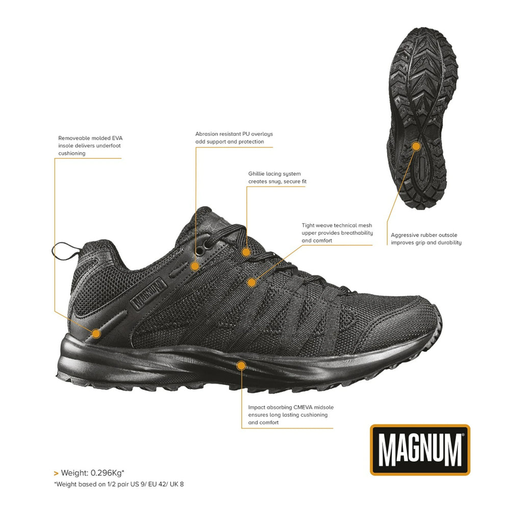 Der Magnum Storm Trail Lite Schwarz ist ein vielseitiger und extrem leichter Schuh für Outdoor-Abenteuer, taktische Einsätze und den Alltag. Das schnelltrocknende, atmungsaktive Innenfutter sorgt für ein angenehmes Fussklima, während der gepolsterte Schaft und die Zunge zusätzlichen Komfort bieten. Die CMEVA-Zwischensohle gewährleistet optimale Stossdämpfung und entlastet die Gelenke. Für sicheren Halt auf unterschiedlichstem Terrain sorgt die rutschfeste und griffige Gummisohle. Die 5-Loch-Schnürung und die praktische Anziehlasche erleichtern das An- und Ausziehen.