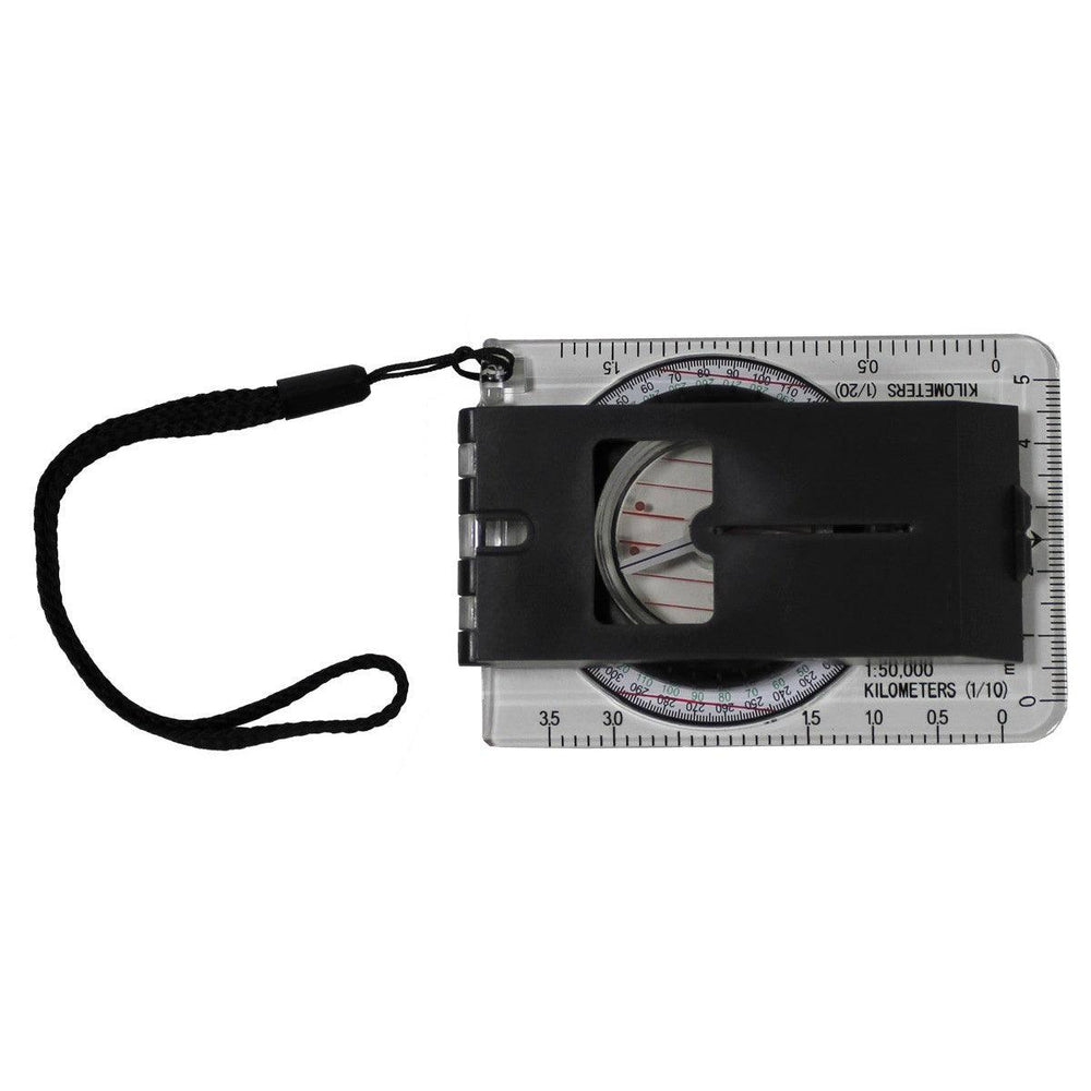 Der Karten-Kompass in seinem Kunststoffgehäuse ist transparent und flüssigkeitsgedämpft. Der Kompass hat eine drehbare Kompassdose und seine Kompassrose hat eine 360°-Einteilung. Die transparente Grundplatte hat eine Lupe und eine Anlegekante mit einem Maßstab 1:25000 und 1:50000, sowie eine cm-Skala. Der Kompass hat einen Deckel mit Spiegel, Peilschlitz und Sichtfenster. Im Lieferumfang ist eine Tragekordel enthalten.