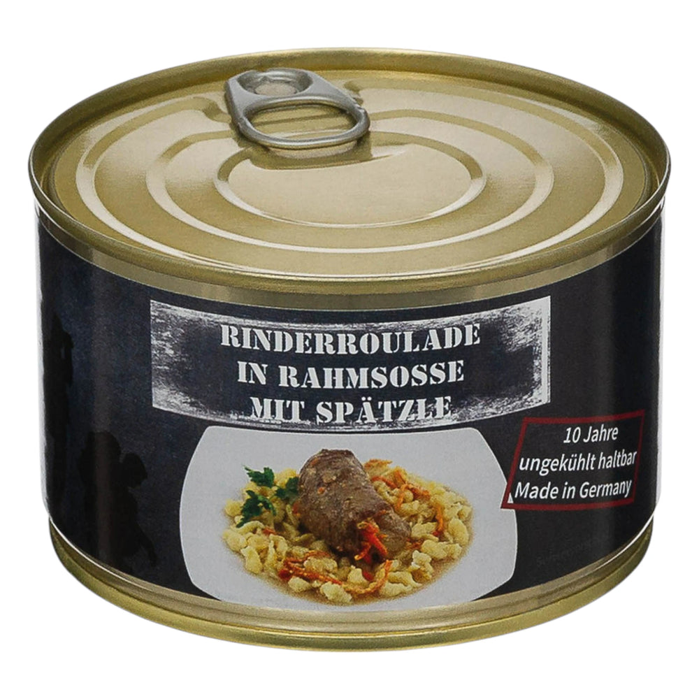 Die MFH Rinderroulade mit Spätzle ist eine herzhafte Mahlzeit, die traditionelles Handwerk und hochwertige Zutaten vereint. Hergestellt in Deutschland ohne Konservierungsmittel, Geschmacksverstärker oder Separatorenfleisch, überzeugt sie durch authentischen Geschmack. Mit einem hohen Anteil an Rindfleisch und fein abgestimmten Gewürzen bietet dieses Gericht echten Genuss. Die Spätzle aus besten Zutaten ergänzen die Mahlzeit perfekt. Die Konserve ist ideal für Outdoor-Abenteuer, Notvorräte oder schnelle Mahlzeiten zu Hause und bleibt ungeöffnet bis zu 10 Jahre haltbar.