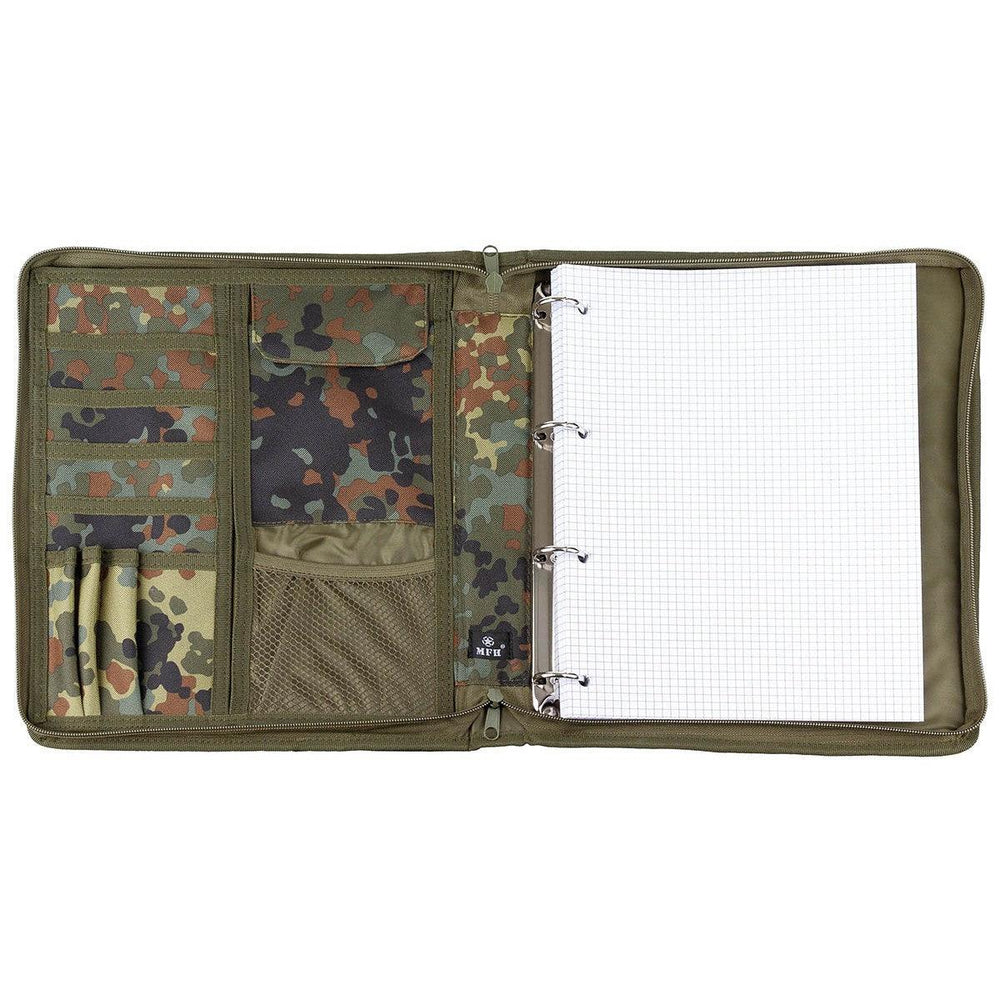 Die Schreibmappe in der Grösse A4 bietet Platz für Schreibmaterialien und Karten. Des Weiteren gibt es eine herausnehmbare Ringbuchhalterung. Die Schreibmappe ist komplett aufklappbar und wird geöffnet und geschlossen durch ein Reissverschluss. Vorne hat es ein Klettflauschpatch (12 x 2.5cm).