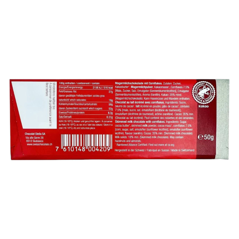 Zuaten Zucker, Kakaobutter (Rainforest Alliance Certified) , Magermilchpulver, Kakaomasse (Rainforest Alliance Certified), Cornflakes 7.5%, Emulgator, Aroma. Kakao: 35% min.