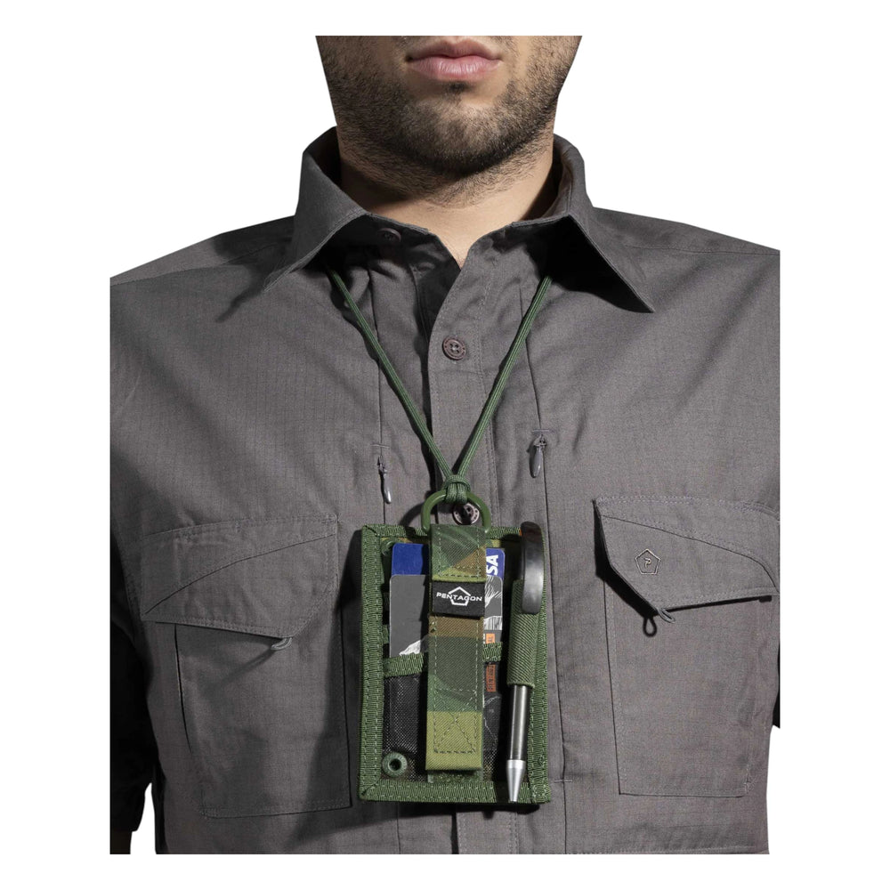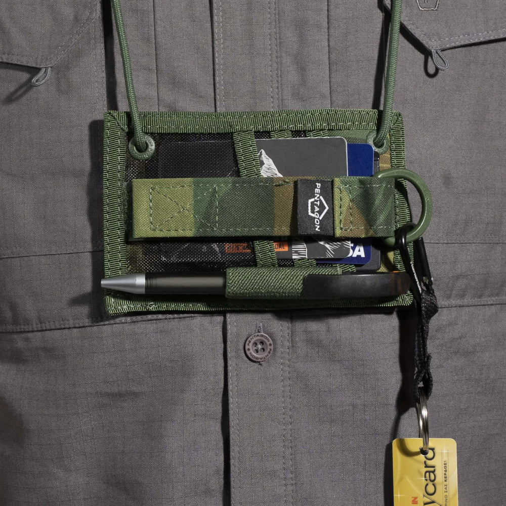 Der Pentagon ID Karten Halter ist ein praktisches Accessoire für den Alltag und ideal für den Einsatz unterwegs. Er bietet Platz für Ausweise, Kreditkarten, Visitenkarten oder den Führerausweis. Mit zwei abnehmbaren Panels kannst du deine wichtigen Karten und Dokumente flexibel organisieren. Dank des robusten Nylonmaterials und des durchdachten Designs bleibt alles sicher verstaut. Eine transparente Mesh-Fläche sorgt für schnelle Sichtbarkeit, während zusätzliche Schlaufen Platz für Stifte oder kleine Tools bieten. Der Kartenhalter ist leicht, kompakt und vielseitig einsetzbar – ob im Beruf, auf Reisen oder im Einsatz.