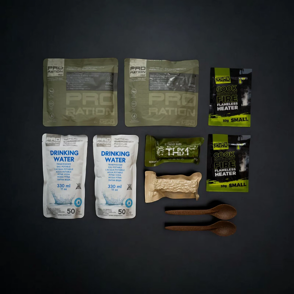 Das Pro Ration Emergency Food/Water Menu V bietet eine ausgewogene Notfallration, die sowohl vegane als auch fleischhaltige Mahlzeiten enthält. Es umfasst zwei leckere Hauptgerichte, zwei Energieriegel und sterilisiertes Trinkwasser, die zusammen mit den flammenlosen Erhitzern in einer wasserdichten Tasche verpackt sind. Diese Ration ist ideal für Krisensituationen oder Outdoor-Aktivitäten und bietet eine Haltbarkeit von bis zu 15 Jahren.