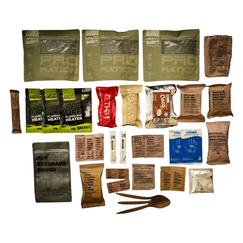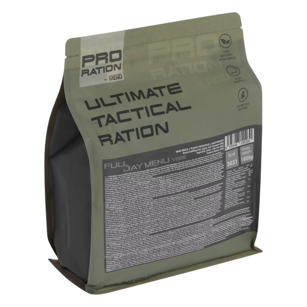 Die Pro-Ration Ultimate Tactical Ration Full-Day Menu Vegetarisch ist eine umfassende Tagesration für eine Person, die speziell für Vegetarier entwickelt wurde. Diese hochwertige Notfallverpflegung enthält drei vollwertige, gefriergetrocknete Mahlzeiten sowie eine Vielzahl von Snacks und Getränken. Alles ist sicher in einer wasserdichten Folientasche verpackt, ideal für den Einsatz in extremen Situationen oder auf Outdoor-Abenteuern.
