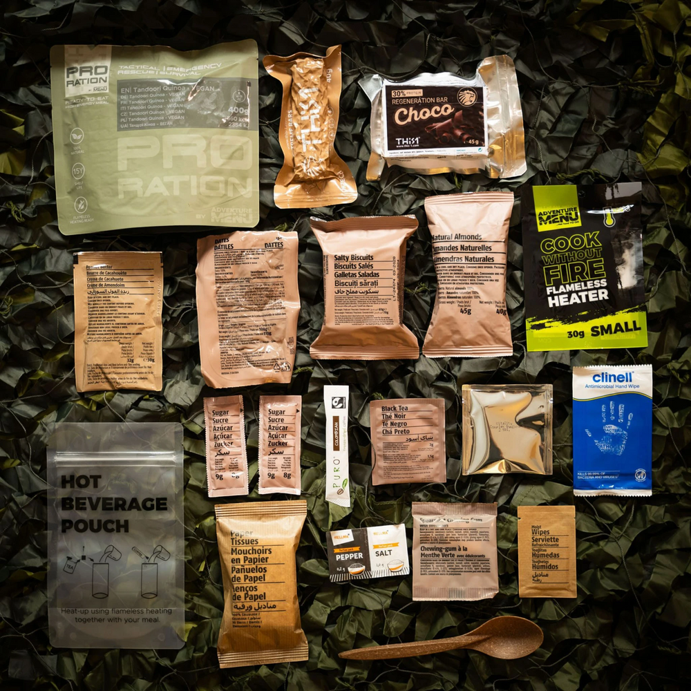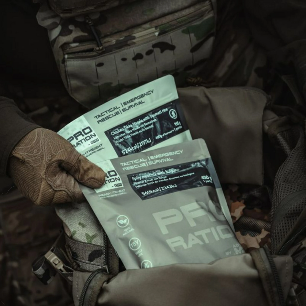 Das Pro-Ration Ultimate Tactical Ration Halbtagesmenü Vegetarisch bietet eine ausgewogene und nahrhafte Verpflegungslösung für Vegetarier, ideal für Outdoor-Aktivitäten oder taktische Einsätze. Das Set enthält eine schmackhafte Hauptmahlzeit sowie eine Vielzahl an energiereichen Snacks, die den ganzen Tag über für die notwendige Energie sorgen. Das Menü wurde in Zusammenarbeit mit militärischen Spezialeinheiten entwickelt und entspricht den NATO-Spezifikationen.