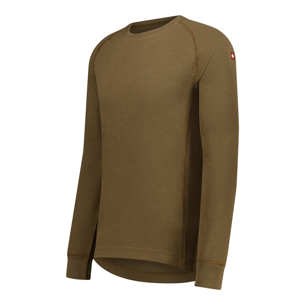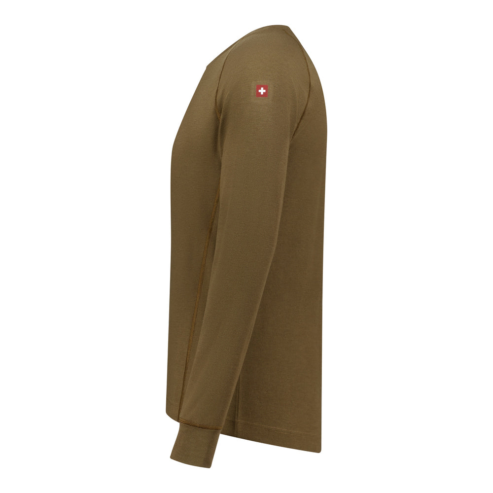 Das Langarm-Shirt 18 ist Teil des modularen Bekleidungs- und Ausrüstungssystems (MBAS) der Schweizer Armee. Es wurde speziell für den Einsatz bei warmem Wetter entwickelt und bietet optimalen Tragekomfort bei Temperaturen zwischen 10 °C und 40 °C. Das Material aus Lyocell und Polyester sorgt für ein angenehmes Hautgefühl und eine gute Feuchtigkeitsregulierung. Der Rundhalsausschnitt sowie die enganliegenden Ärmelbündchen gewährleisten eine bequeme Passform. Dank des leicht erhöhten Schnitts vorne sitzt das Shirt optimal unter der restlichen Ausrüstung. Auf beiden Oberarmen befindet sich das Nationalitätsabzeichen der Schweizer Armee.