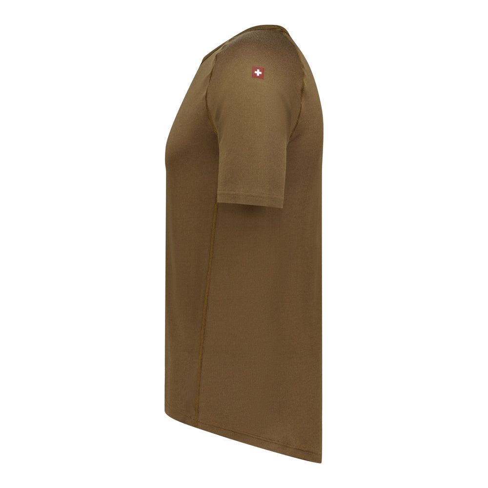 Das T-Shirt 18 ist Teil des neuen modularen Bekleidungssystems (MBAS) der Schweizer Armee. Entwickelt für den Einsatz bei warmem Wetter, bietet es optimalen Tragekomfort zwischen 10° C und 40° C. Das funktionale Material aus Lyocell und Polyester sorgt für hohe Atmungsaktivität und schnelles Trocknen. Ein leicht höher geschnittener Frontbereich und die Ärmelbündchen verbessern die Passform. Das Nationalitätsabzeichen an beiden Oberarmen unterstreicht den Schweizer Charakter. Ein ideales Shirt für militärische Einsätze oder den anspruchsvollen Outdoor-Bereich.